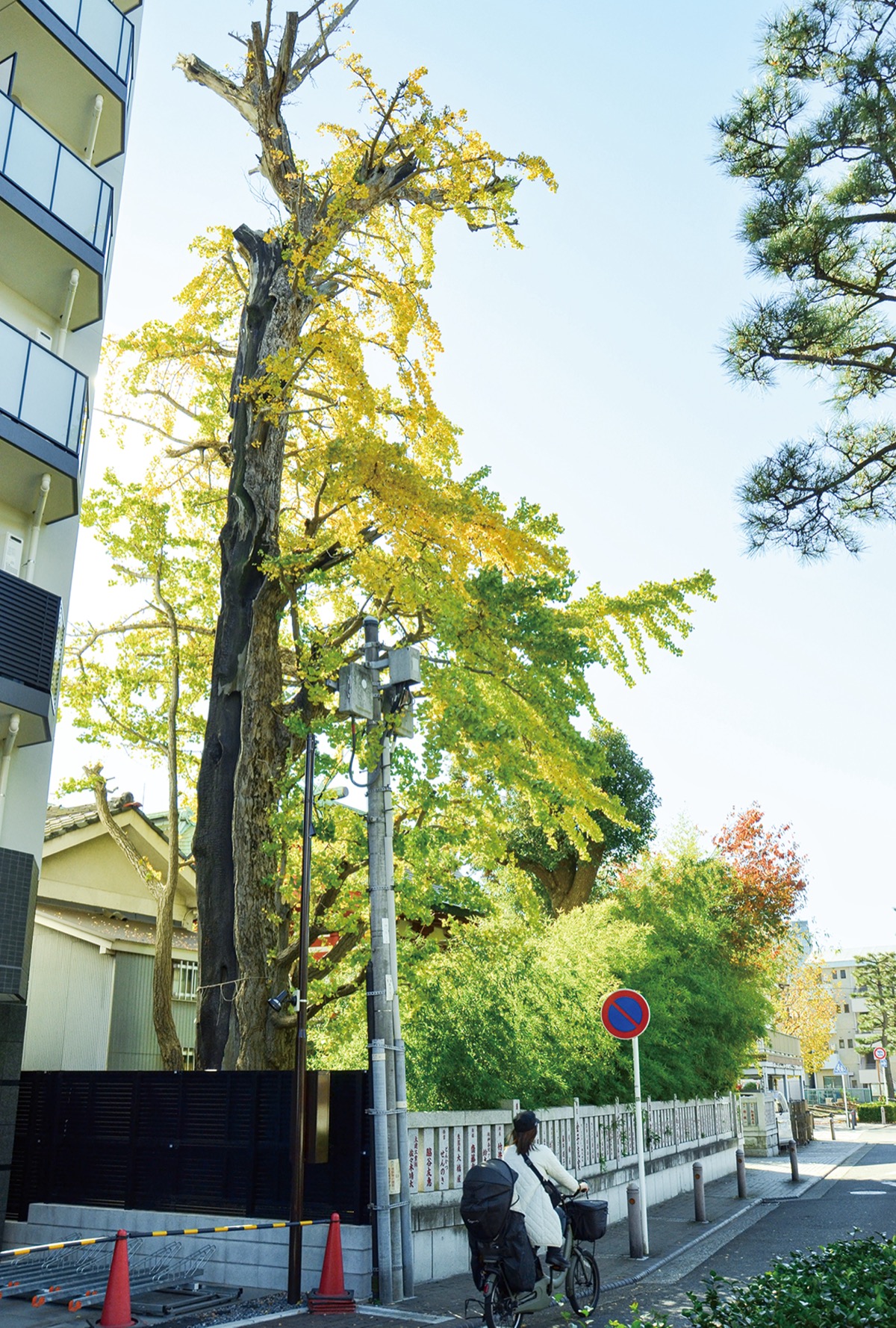 東神奈川駅そばにある熊野神社で、「戦災樹木」のイチョウが色づく時を待っている。