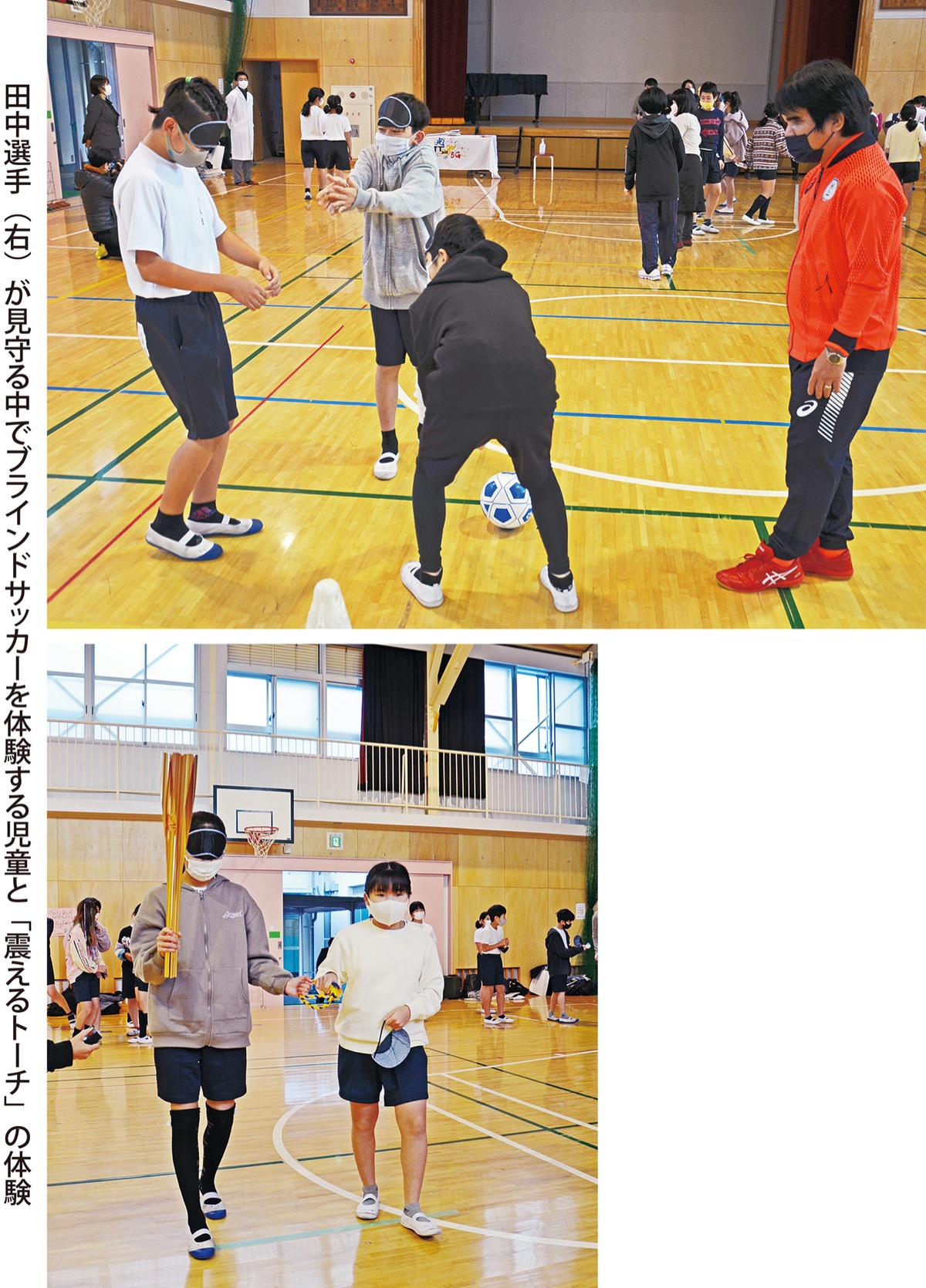 児童は田中選手の指導でブラインドサッカーを体験し、アイマスクをしながらドリブルをしたり、離れた相手の掛け声を頼りにパスを出したりして競技を楽しんだ。サッカーが得意という児童は「真っ暗な中でボールを蹴るのは怖くて、田中さんのようにドリブルできるのは本当にすごい」と驚いた様子。日本代表の試合はテレビで観戦したといい、「どのプレーも速くて興奮した。これからもブラインドサッカーを応援したい」と話した。