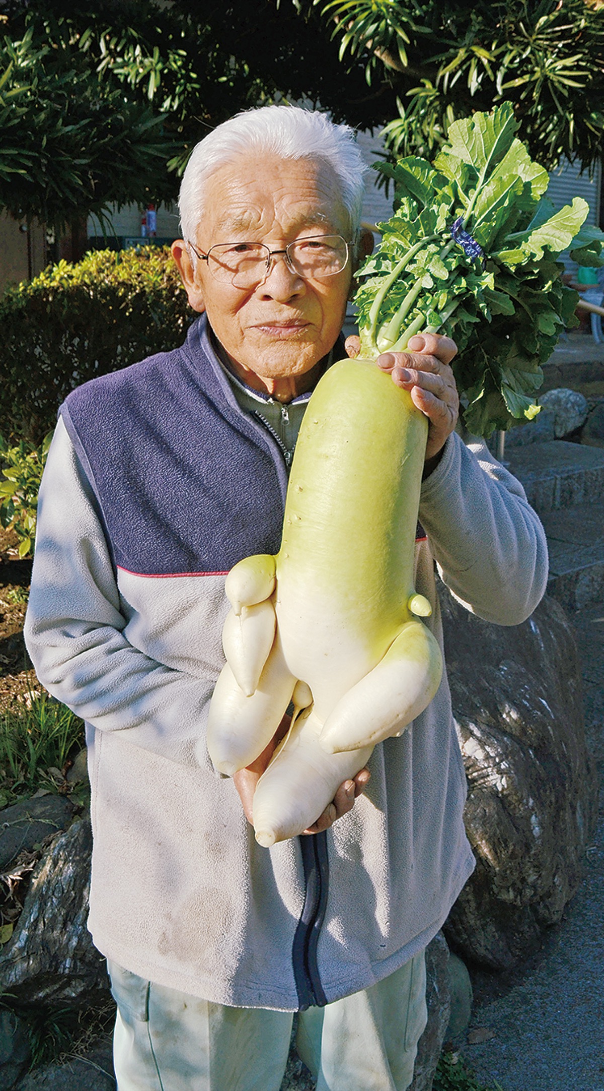 10年以上前にも下部が脚のような形をした大根を収穫したという関口さん。「人型は滅多に獲れないのでうれしい」と、「縁起物」の大根を大事そうに抱えていた。