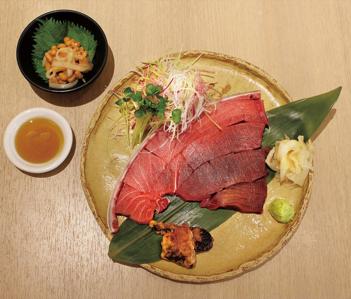 「まぐろグラデーション定食」と銘打ったメニューは、横浜市中央卸売市場が扱うまぐろの中トロと赤身を贅沢に使用。まぐろを輪切りにしたような盛り付けにこだわり、中トロから赤身へと色が変化していく姿が楽しめる。たれには岩井のごま油と横浜醤油の調味料を使用した。