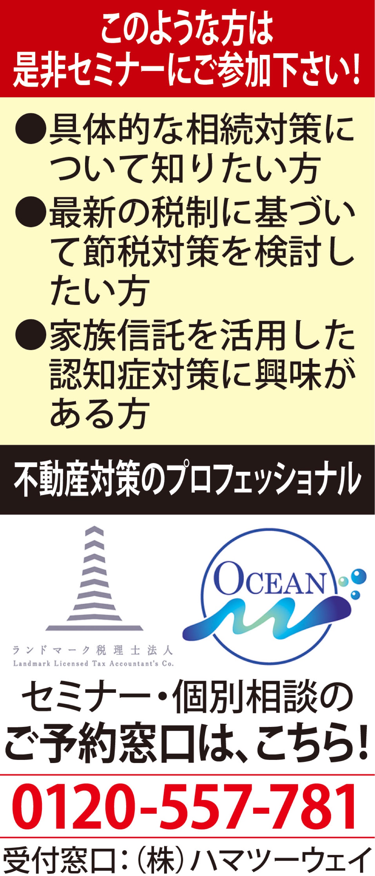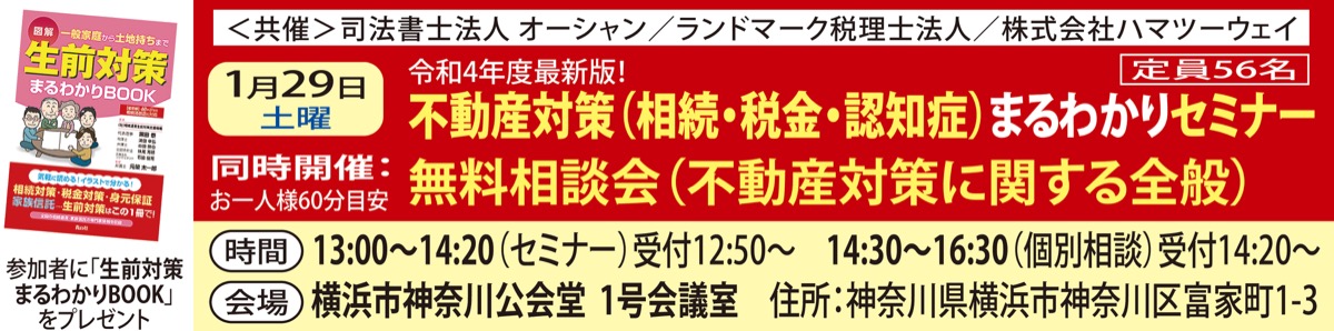 そこで、今のうちから将来に備えてどのような対策を行うべきかを分かりやすく伝える「不動産対策(相続・税金・認知症)まるわかりセミナー」を1月29日(土)、神奈川公会堂1号会議室で開催する。セミナーでは最新の税制に沿った税金対策や、NHKでも取り上げられた「家族信託」を活用した認知症対策についても解説する。終了後には、全国でもトップクラスの相続税申告実績を誇るランドマーク税理士法人税理士・岡山敦氏と筆野氏が60分の無料個別相談に応じてくれる。