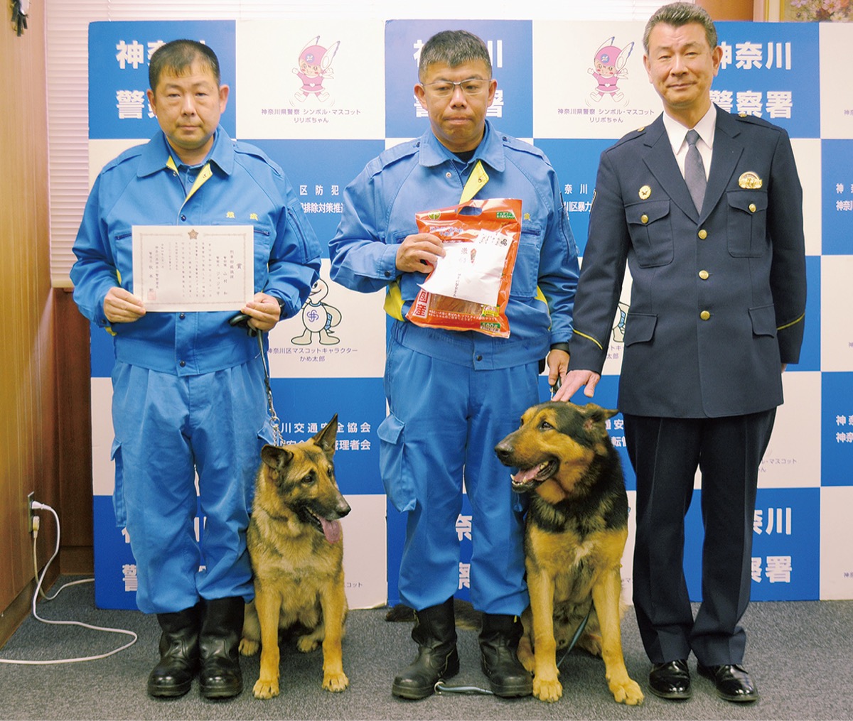 区内で行方不明になった認知症の高齢男性発見に貢献したとして、神奈川警察署は1日、神奈川県警鑑識課の警察犬2頭と同課の警察官2人を表彰した。