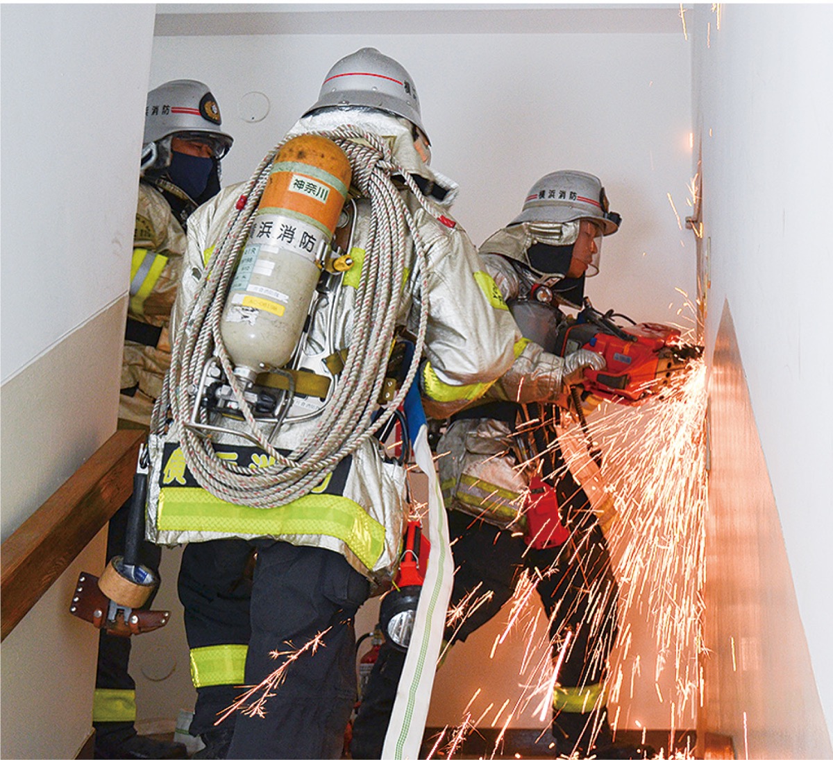 初回の訓練には片倉消防隊や浦島消防隊、松見特別救助隊などが約15人が参加。3階建ての建物で火災が発生し、上階の部屋に住民が取り残されている想定のもと、煙をたいて視界の悪い環境を作り出した。消防隊員はエンジンカッターでのドア切断やはしごを用いたベランダからの負傷者救助、声を出しての状況・連携確認などを行った。緊迫した空気に包まれる中で約40分にわたる実践的な訓練が繰り広げられた。