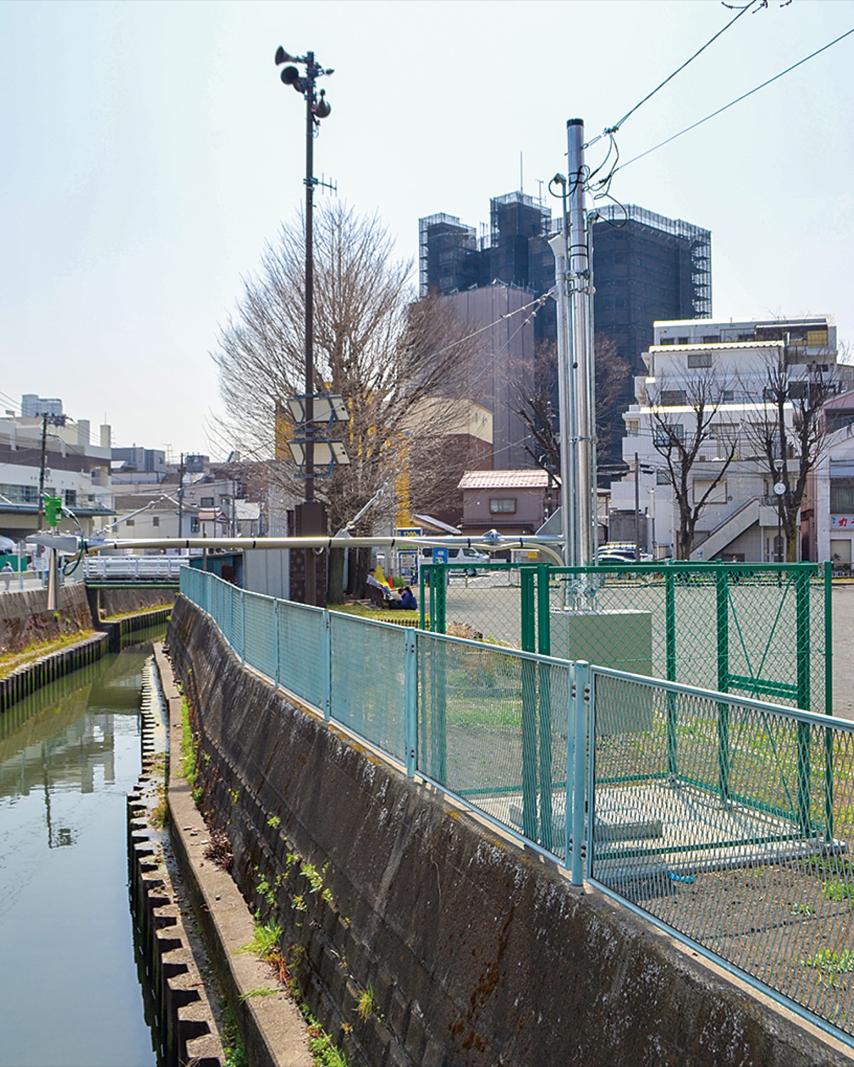 入江川は鶴見区を源流として、子安通で6派川の運河に分かれる約2・3Kmの河川。装置は入江川本流の情報を観測するため、入江川公園内=神之木町=に設置された。