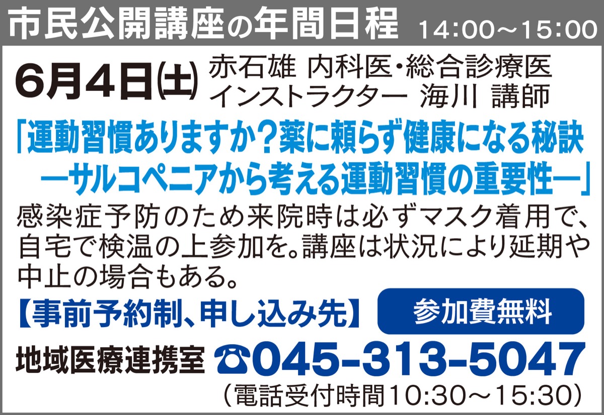 参加者は先着40人までの予定。申込は地域医療連携室【電話】045・313・5047へ。