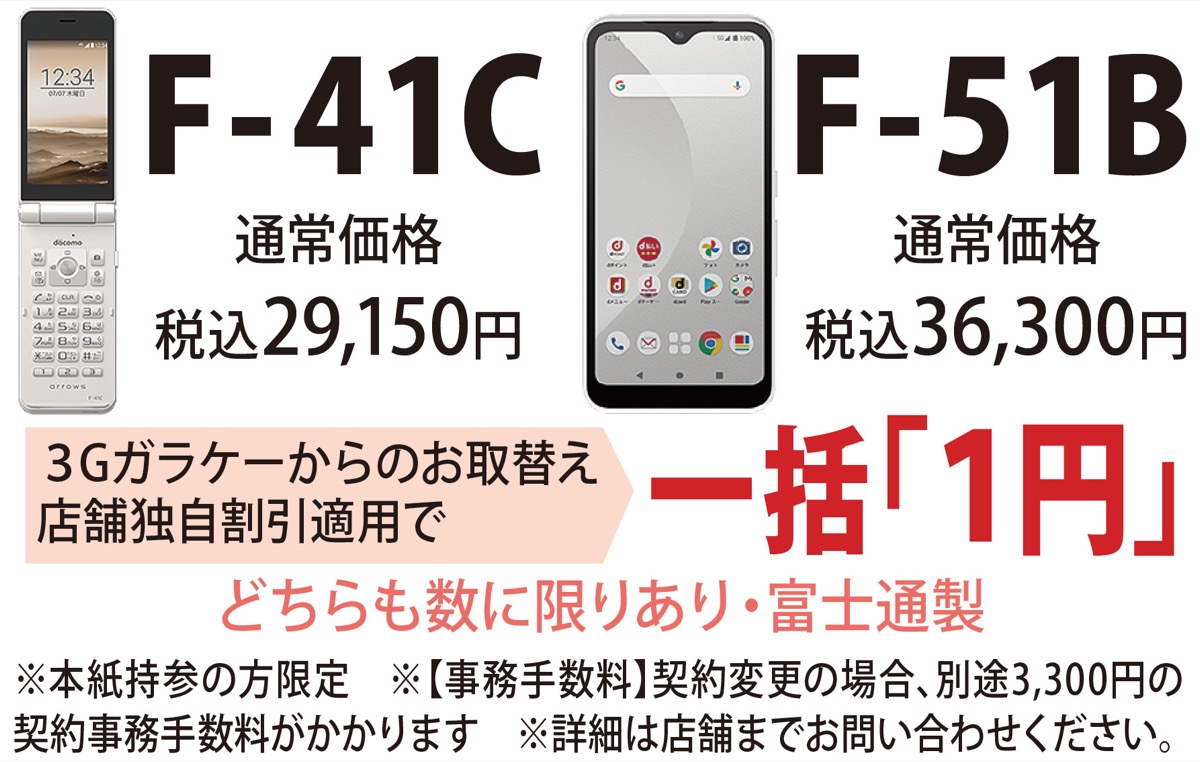 今なら本紙持参の人限定で、ガラケーからの取替の場合、ガラケーとスマホの良いとこ取りの「F―41C」または人気のスマホ「F―51B」が1円(それぞれ数に限りあり)。同機種は国産メーカー「富士通製」なのも安心だ。