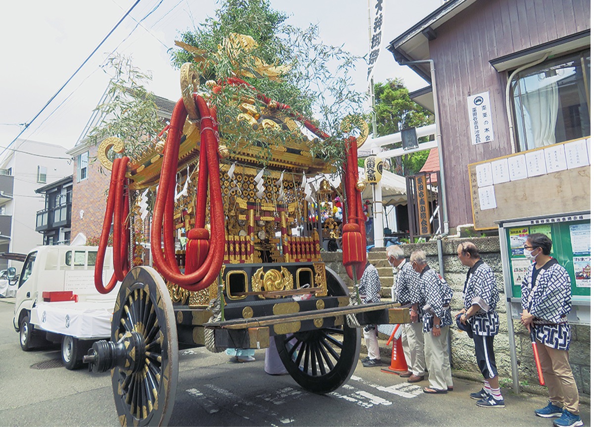 また同神社の例祭の中で大きな特徴でもある「お浜下り」の神事も12日に実施。創建当初、海に神輿を担ぎ入れていたと伝わることからその名が付けられ、今では栄町にあるお浜下りの碑の前で祭典が執り行われている。当日は朝に神社を出発。高さ約4m、重さ約2tの神輿を引くトラックを先頭に、10人ほどの氏子総代と世話人は感染症対策としてバスに乗って続き、夕方頃までかけて37の氏子地域を巡った。