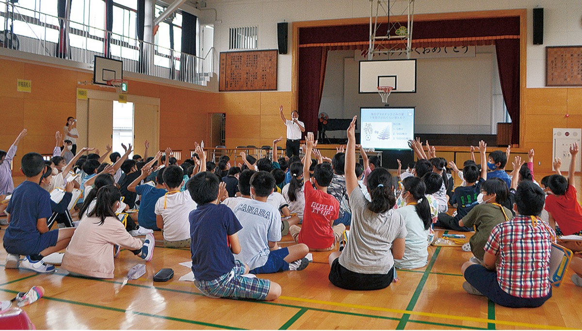 授業では協進印刷の江森克治代表取締役社長が講師を務め、児童たちが考えやすいようにとSDGs17の目標から「海の豊かさを守ろう」をテーマに。海洋ごみの数量6割以上を占めるプラスチックの中でも、ペットボトルや漁具などが多いことを解説。また全世界で1年間に飛行機5万機分相当の海洋プラスチックごみが増えている現状などを、クイズ形式で問いかけながら伝えた。