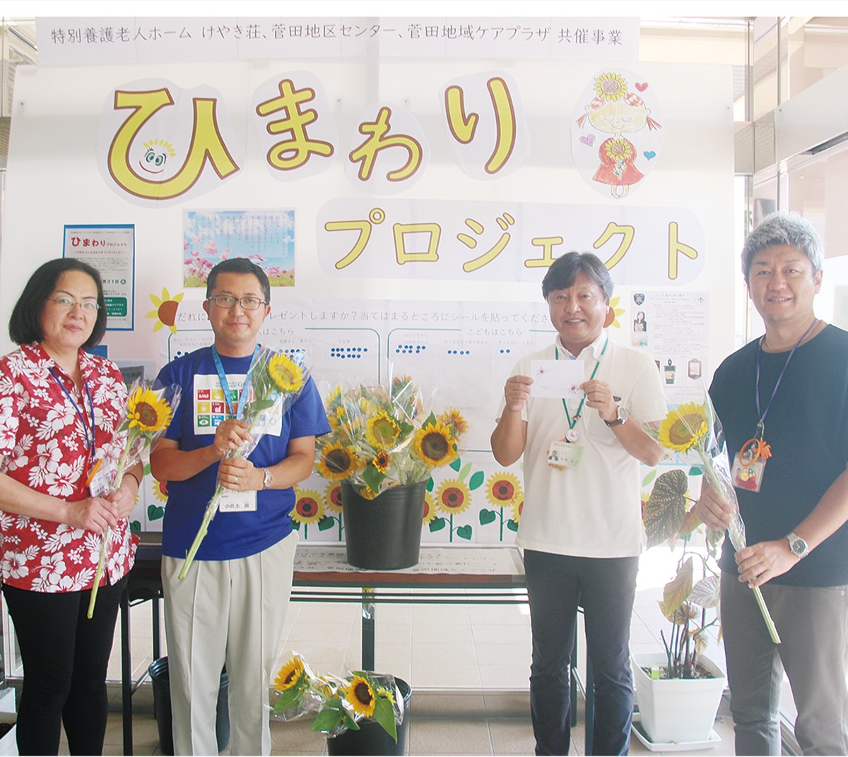 今年は、初めてひまわりの栽培に挑戦。切り花にしやすい大小の花をつける4種類のひまわりを植えた。当初はけやき荘の利用者や職員などに配っていたが、同法人の理事で農園の園主を務める井上友二さん(菅田町在住)は「昨年コスモスの栽培で地域の方に喜んでもらえたので、夏の花も楽しんでほしい」と菅田地域ケアプラザなどと共同事業を模索。「ひまわりを大切な人に贈る企画にしたら、コロナ禍で沈んでいる地域の皆さんの気持ちが元気になるのではないか」と今回のプレゼント企画に至った。