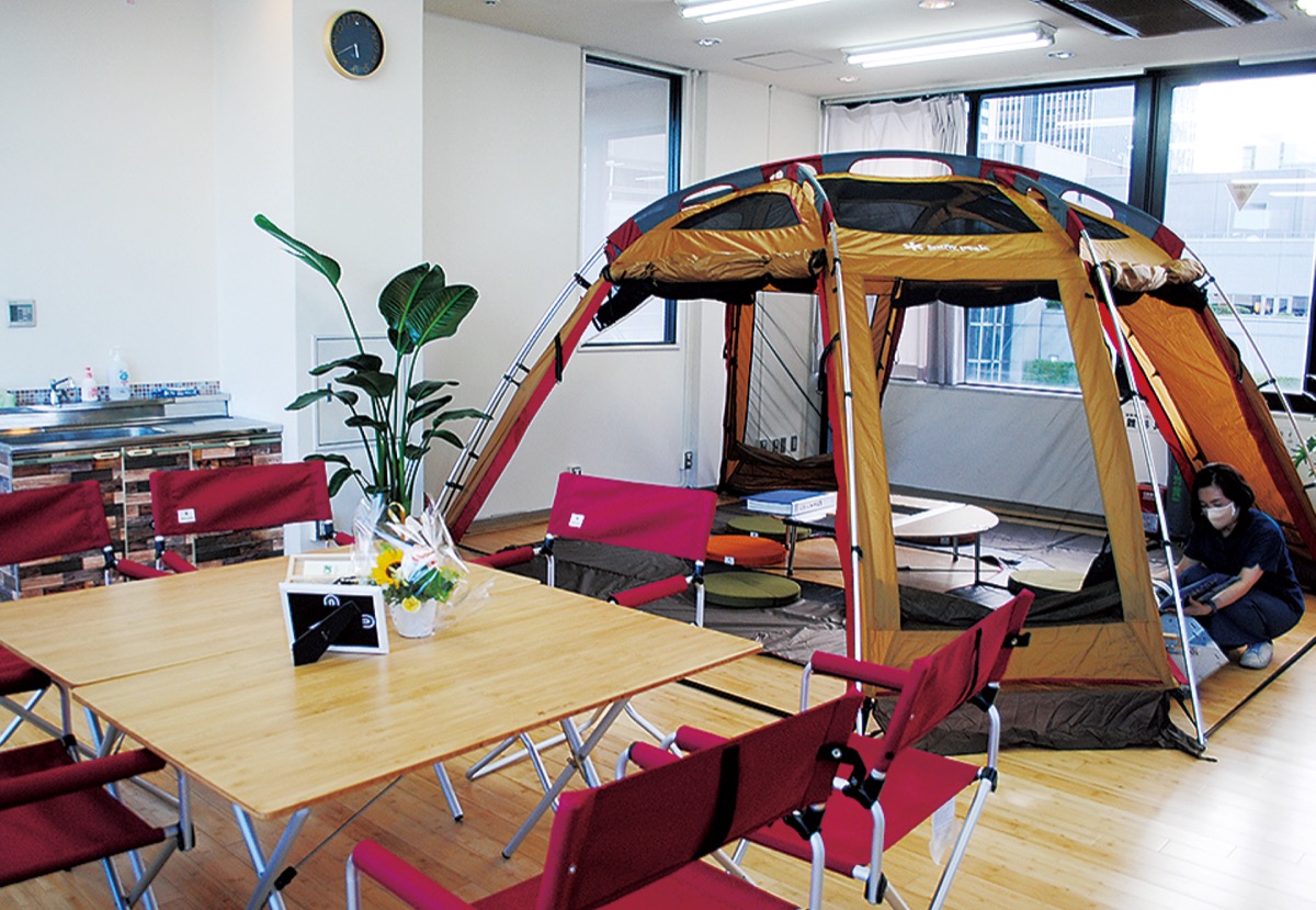 母親らにゆったりとした「自分時間」を提供する場にするため、テントを設置するなど家具はアウトドア製品を使用し、開放的でリラックスできる雰囲気に。家具の移動も容易なため、限られたスペースを有効に使い、会議やセミナー、スタジオとしても利用することができるよう工夫が凝らされている。