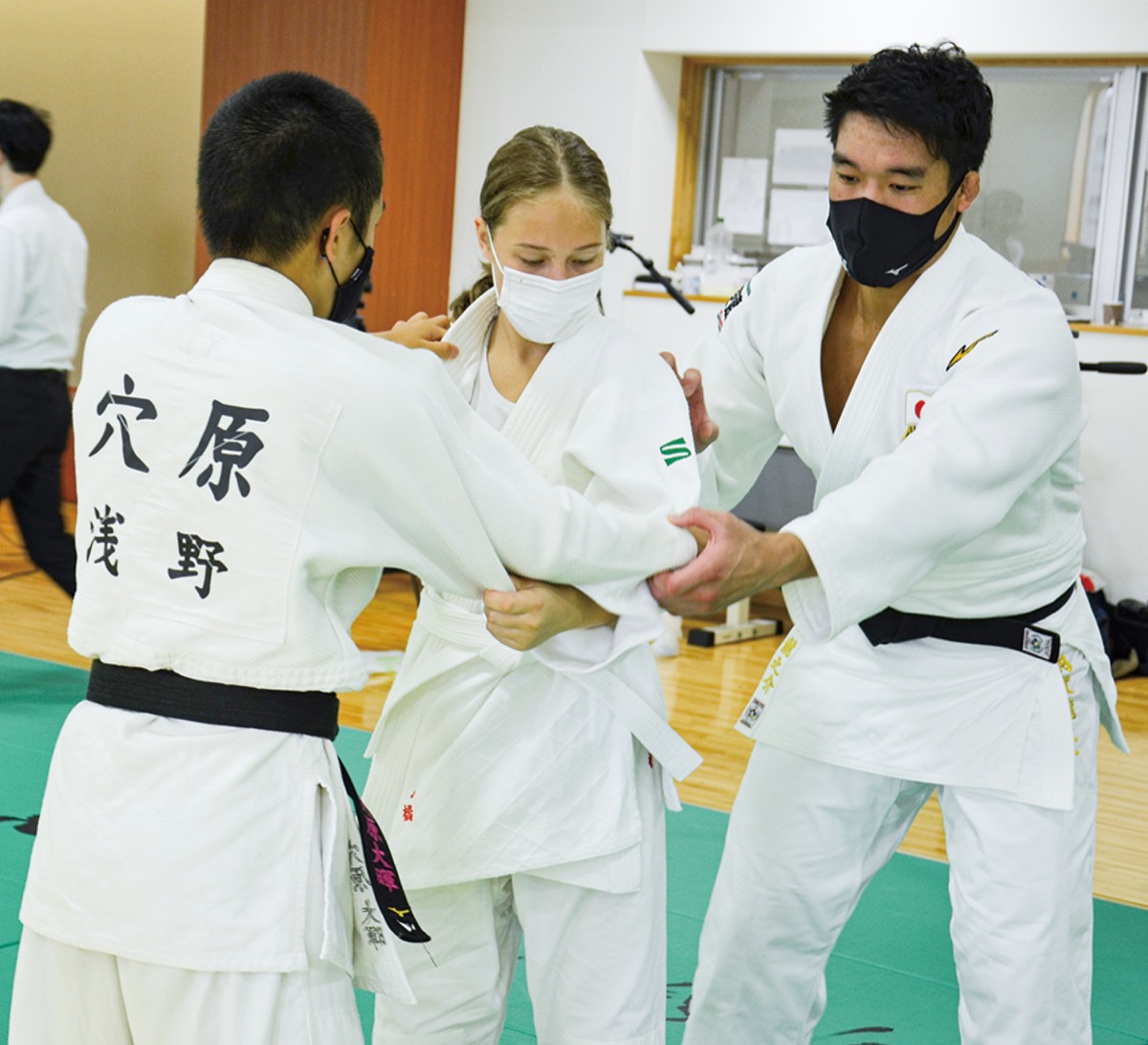 当日は同クラブに所属する小学生から高校生までとコーチを合わせた14人のほか、浅野中・高や慶応高、逗子開成高の柔道部員ら約60人が参加。約2時間半にわたって稽古が行われ、両国の学生同士が投げ技などの練習や実践形式で技を掛け合う「乱取り」などを通して交流を深めた。時には羽賀選手と井上氏も学生と組み合い、高校生を相手に、技に動じない鍛え抜かれた体幹を披露。ウクライナの小学生には、背負い投げを決められるなど微笑ましい場面も見られた。
