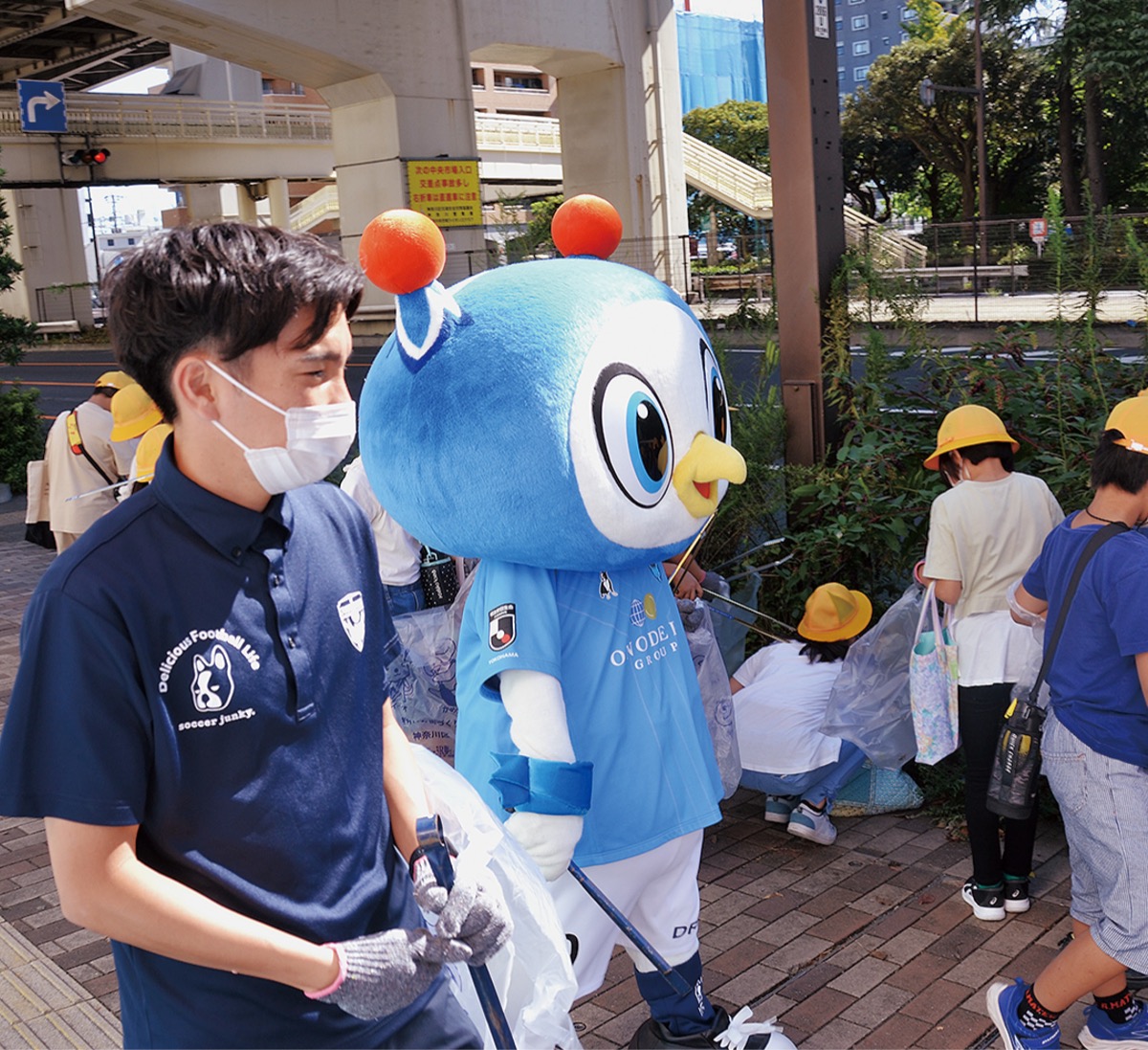 また今回はサッカーJ2リーグに所属する横浜FCのマスコット「フリ丸」も参加。幸ケ谷小学校4年生の児童と一緒に、宮前商店街や青木橋などを回り、道に落ちているごみをトングで拾っていった。