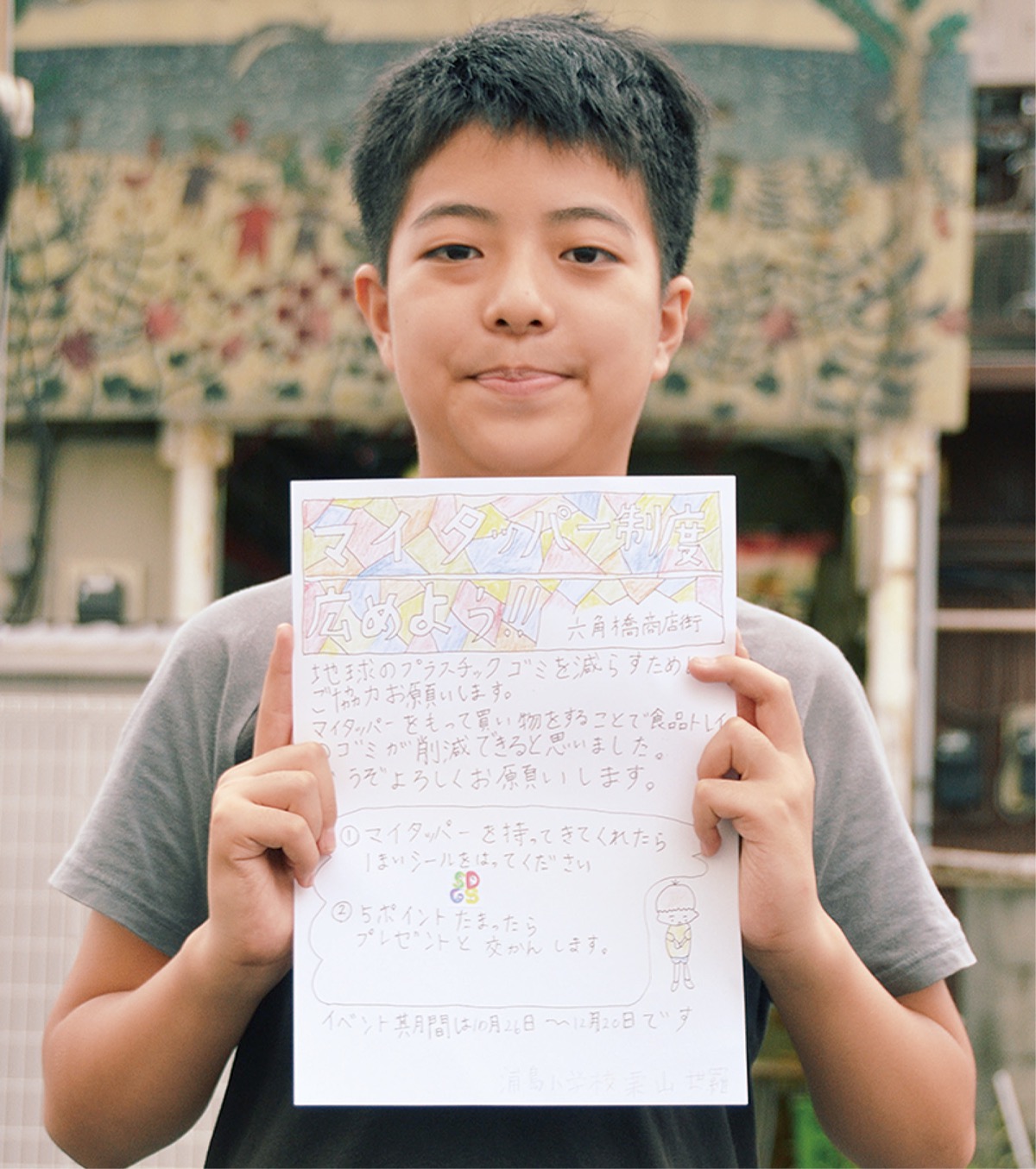 六角橋商店街内の一部飲食店で10月26日から12月20日まで、テイクアウトの購入者にマイタッパーの持参を呼びかける取り組みが行われる。企画したのは、浦島小学校6年生の栗山世羅さん。協力した購入者には店舗からシールが手渡され、5枚集めるとプレゼントと交換できる仕組みだ。