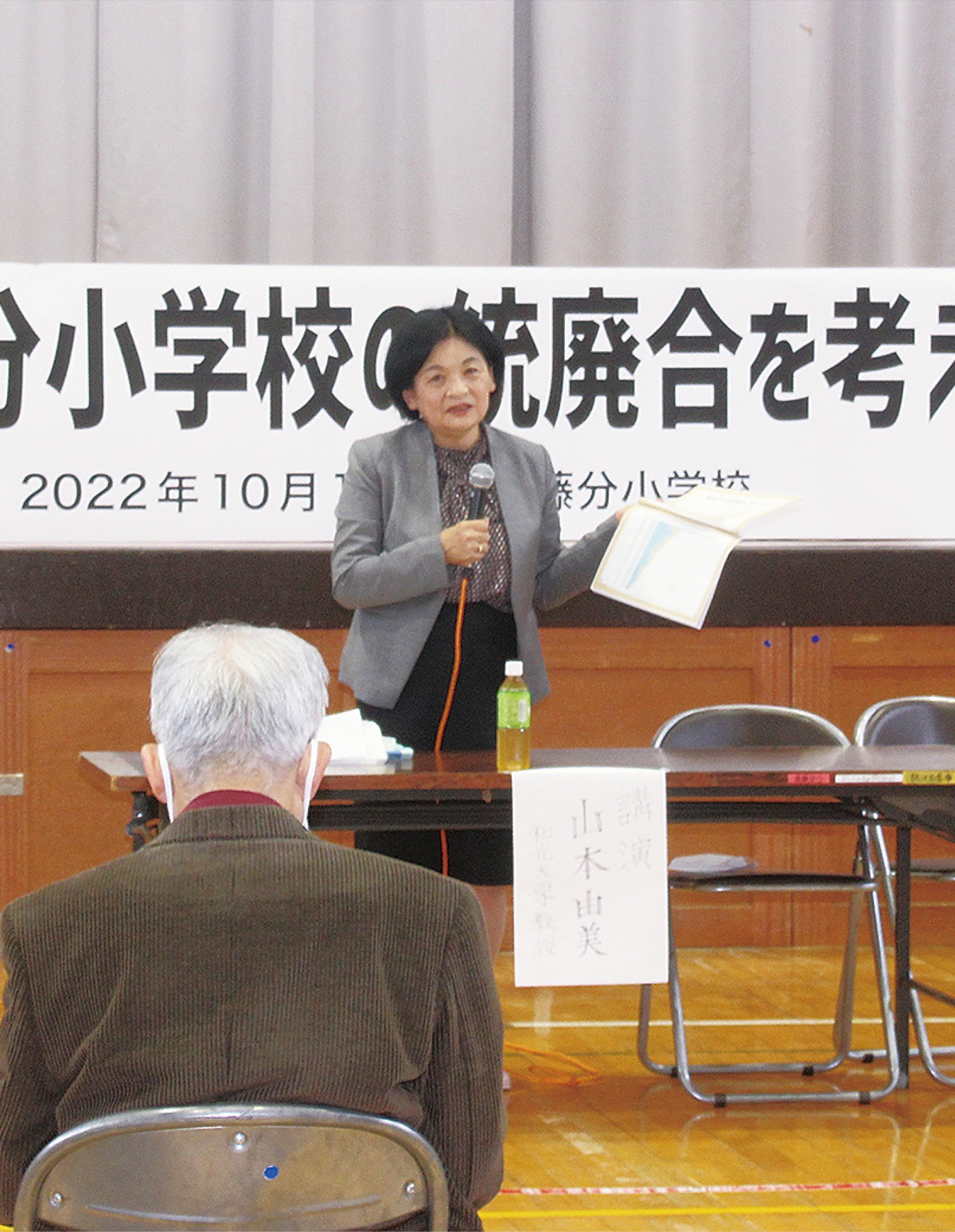 「二谷・斎藤分小学校の統廃合を考えるつどい」が10月10日、斎藤分小学校で開催された。主催は地域住民らで構成される「二谷小学校の建替えと斎藤分小学校の統廃合を考える会」(滝田賢治代表)。当日は、約60人が参加。学校統廃合の研究を行う和光大学の山本由美教授が「学校統廃合問題を考える」をテーマに講演し、参加者で意見交換などを行った。