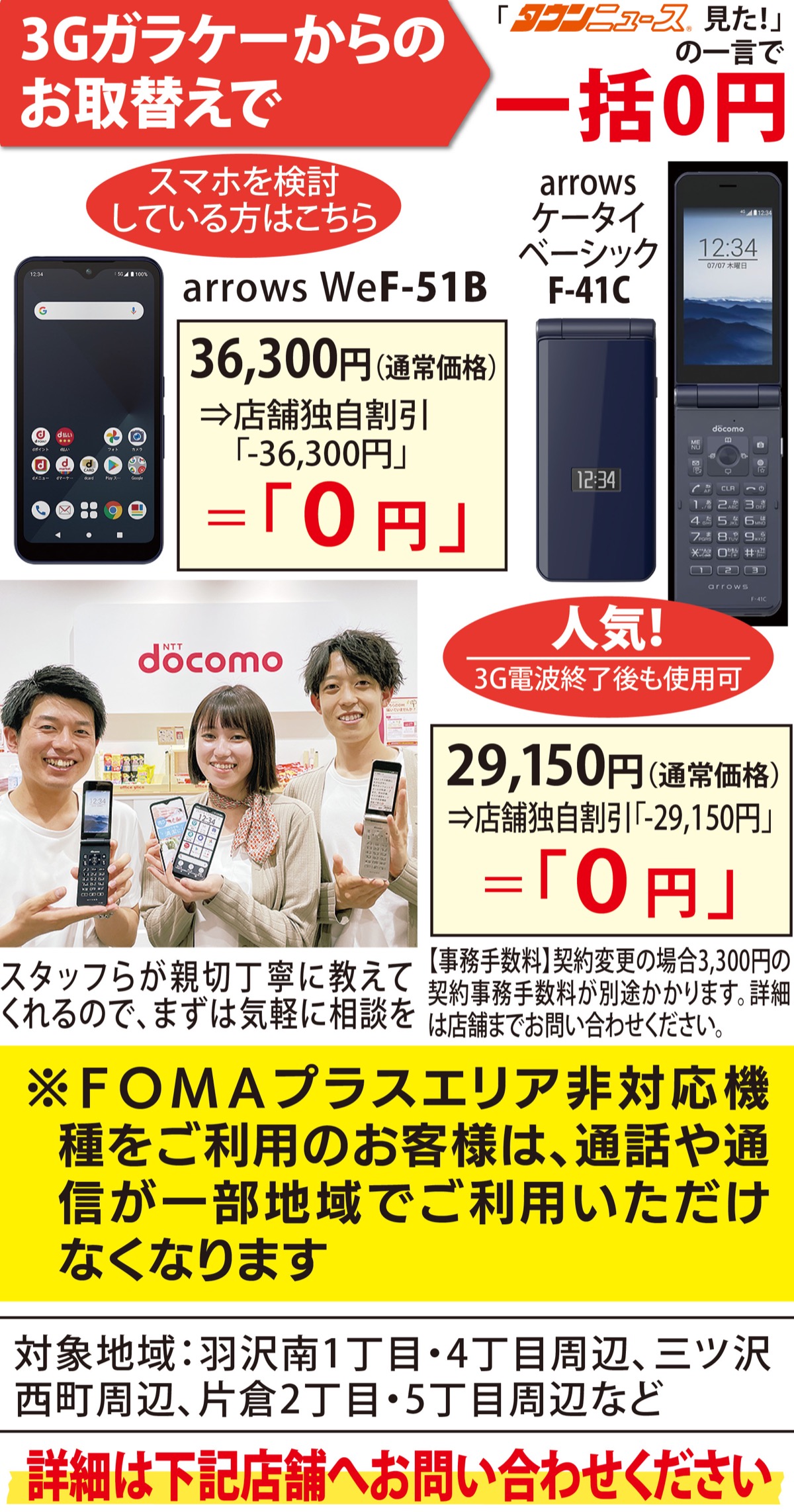 ドコモショップの下記2店舗では現在、ガラケーから機種変更時に「TN(タウンニュース)を見た」の一言で、3G電波終了後も使える折り畳み携帯やスマホが”0円”になるキャンペーンを実施中(各限定10台)。