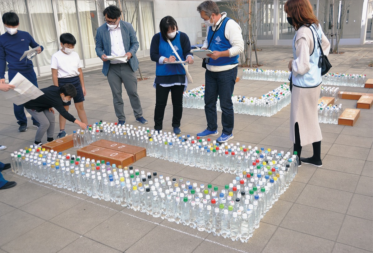 当日は各自で500ミリリットルのペットボトルを持ち寄り、クラスごとに中庭に登場して、水をいっぱいに詰めたペットボトルを置いていった。朝から約3時間をかけ、横約8m・縦約3mの大きな「150」が出来上がった。