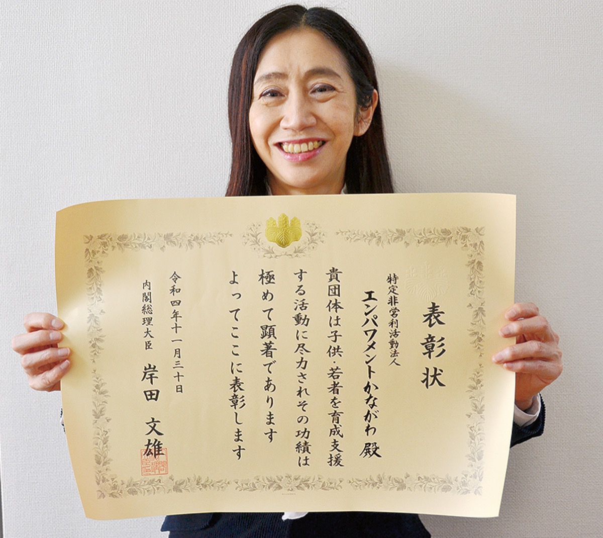 NPO法人エンパワメントかながわ=台町=が、令和4年度「子供と家族・若者応援団表彰」の子供・若者育成支援部門において内閣総理大臣表彰を受賞した。11月30日に都内で行われた式典で表彰状を手にした阿部真紀理事長は「2004年の設立以来、様々な世代・属性に人権啓発を行ってきた。活動が評価されて嬉しい」と喜びを口にした。