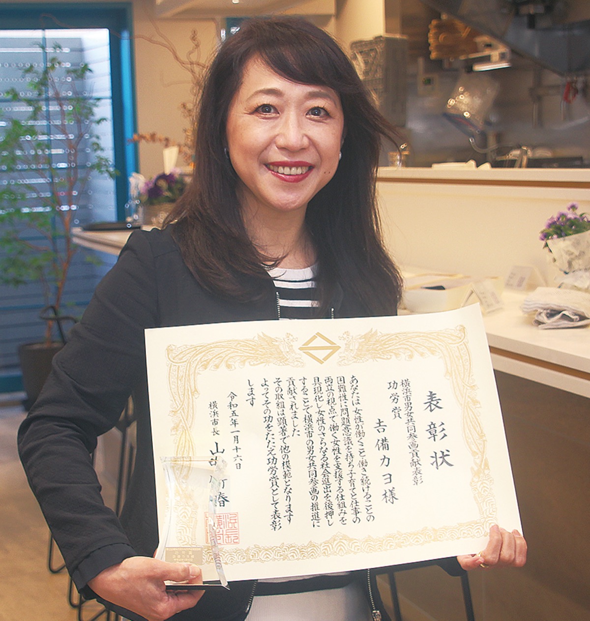 人材派遣・紹介を行う(株)ジョビアの代表取締役社長・吉備カヨさん=人物風土記で紹介=が1月16日、横浜市男女共同参画貢献表彰の功労賞を受賞した。長年、就労支援を通じて女性の社会進出に貢献したほか、自社ビルを活用した新規事業で女性の雇用創出に寄与するなどの取組が評価された。