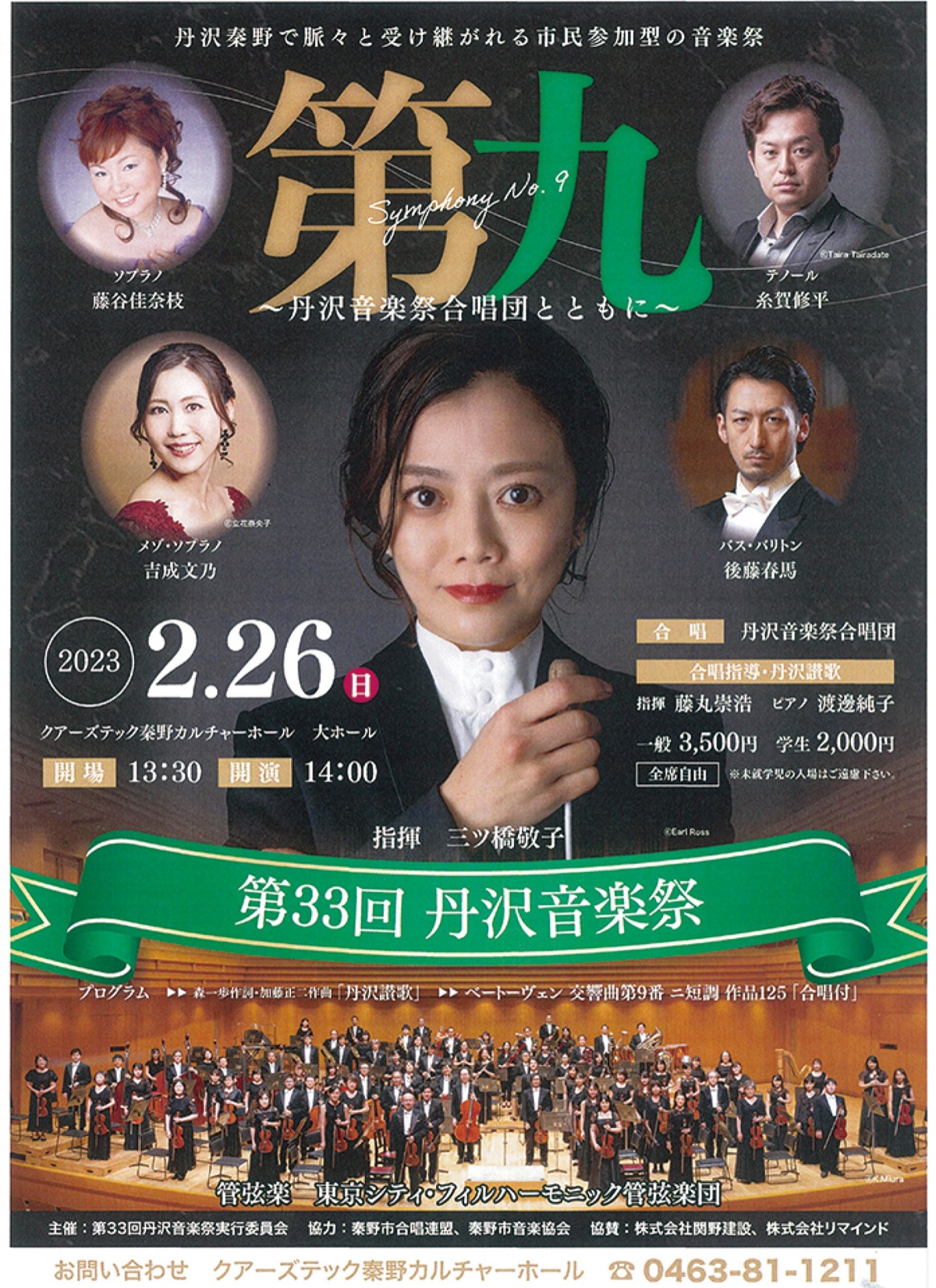 当日は今回のメイン曲・ベートーヴェンの「第九」と丹沢音楽祭の歴史とともに歌い継がれる「丹沢讃歌」が披露される。指揮者には、2009年Newsweek Japan誌で「世界が尊敬する日本人100人」に選出され、2013年には第12回齋藤秀雄メモリアル基金賞を受賞した世界的マエストロの三ツ橋敬子さん、演奏には東京シティ・フィルハーモニック管弦楽団を迎える。丹沢音楽祭合唱団として、約130人の市民合唱団も舞台に登場する。