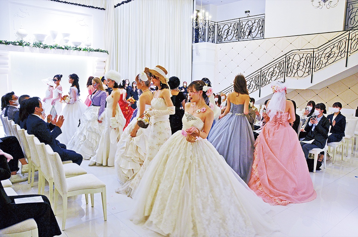 テーマは四季の花をイメージし、デザインや花飾り、メイクなどに落とし込んだ。春夏秋冬それぞれでキュートとクール2つのチームに分かれ、会場ではドレスを身にまとった学生が2人ずつ登場。実際の披露宴でも使用される空間の中でウォーキングを披露し、1チーム5分の中でドレスやメイク、小物など細かい部分までアピールした。