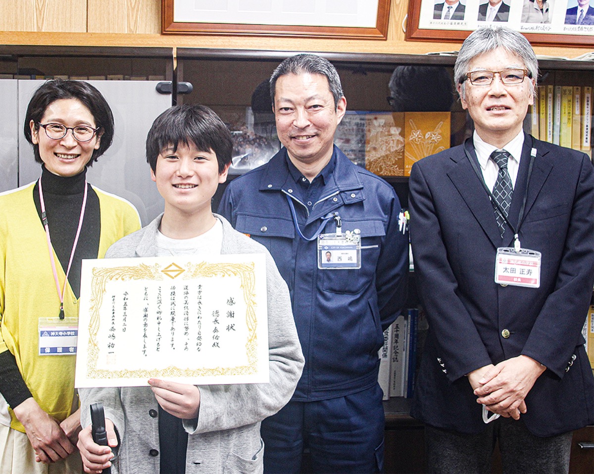 感謝状の贈呈は3月2日、同小の校長室で実施され、徳長君と母・佳代子さんをはじめ、同土木事務所の西嶋所長、太田正寿校長らが出席した。感謝状を徳長君に手渡した西嶋所長は「道路を管理している私たちにとって徳長君の行動にとても感謝しています。中学生になっても、まちの美化に貢献いただきたい。期待しています」と感謝を述べた。そして同土木事務所からは、トングのプレゼントも。徳長君は「この感謝状は、手伝ってくれた弟や友達と一緒に手にできたもの。環境問題に興味があるので、中学生になってもこの活動を続けていければ」と前を見据えた。