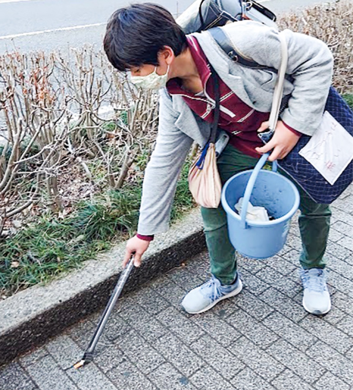 登下校時にランドセルを背負い、手にはバケツとトングを持ちながら、落ちているごみを集めていく。徳長君が2021年12月から毎日欠かさず、1年以上継続している取り組みだ。