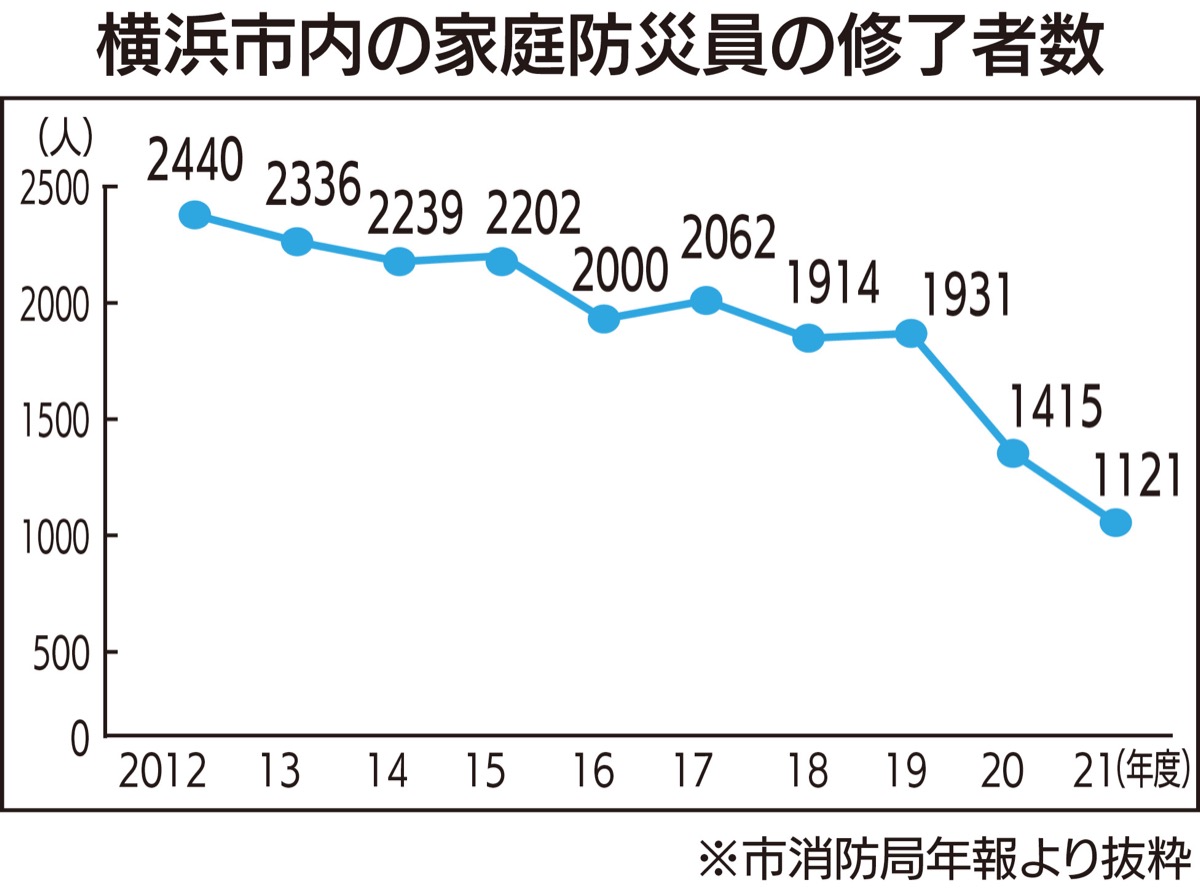 防火・防災に関する知識などを身に付ける「家庭防災員」研修の修了者数が、この10年で半減している。横浜市は4月から受講対象を、自治会町内会の推薦がない人にも拡大。新たに作るウェブサイトも含め、多くの市民に災害へ備えた知識などを広げたい考えだ。