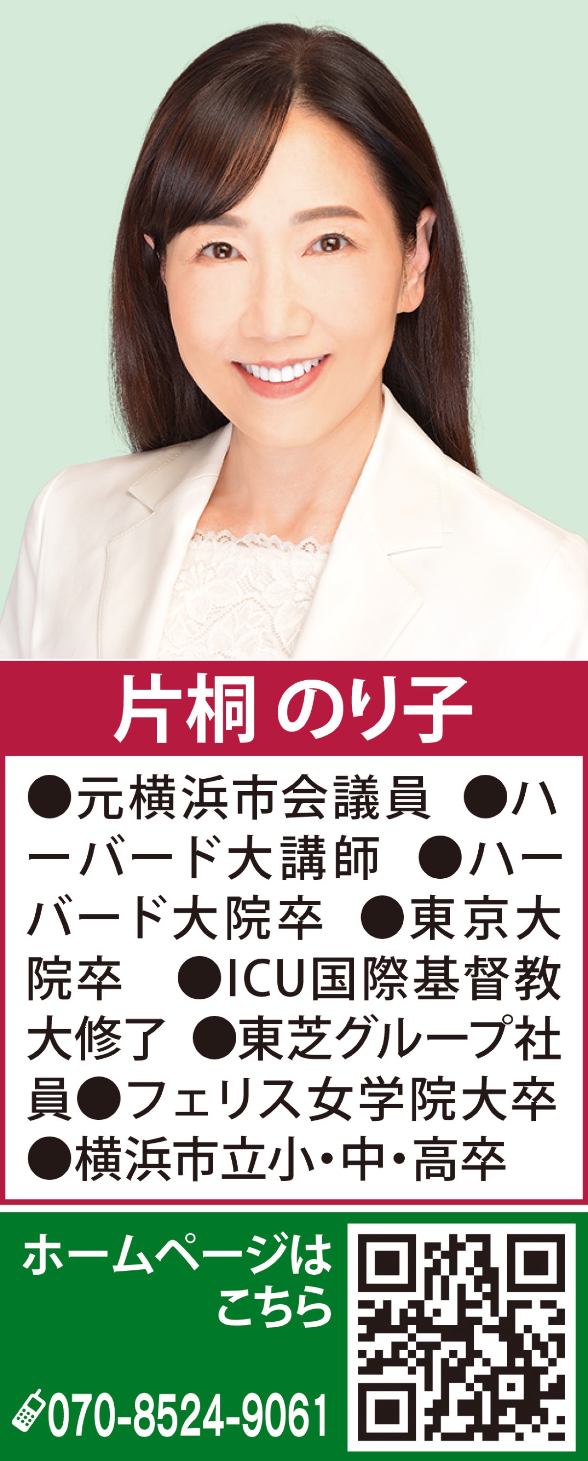 神奈川区は歴史的にも非常に重要な街。地域の歴史や慣習を守りつつ、国際都市横浜の中心として発展してきた魅力あふれるこの街から、皆さんと一緒に、輝く日本を創っていけることを楽しみにしています。政策の8つの柱「片桐のり子八策」はホームページで。