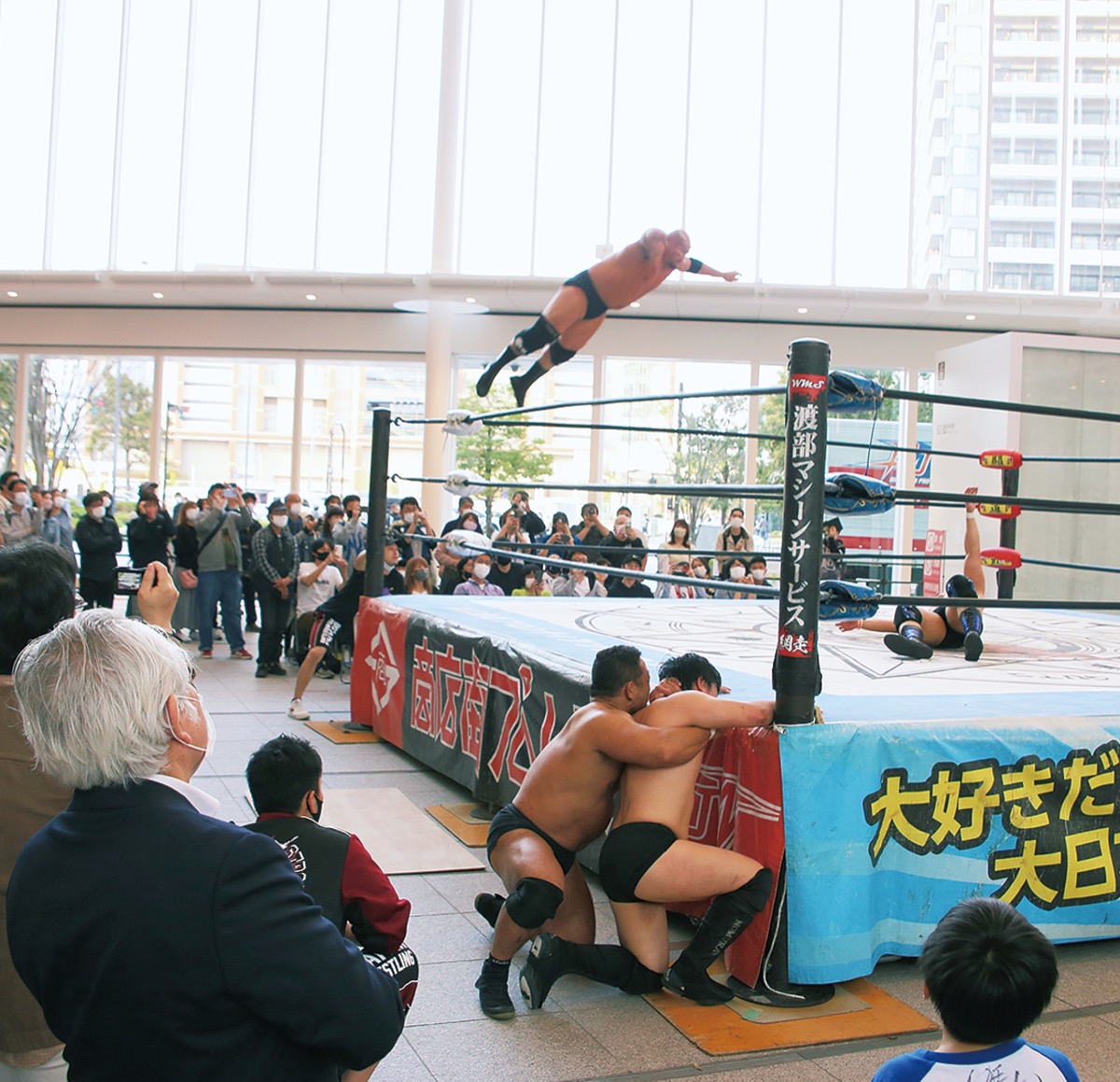 同団体は都筑区に道場を持ち、市内の商店街を使って大会を開く「商店街プロレス」を行うなど、横浜を意識した活動を進めてきた。アトリウムにリングを設置することが可能と分かり、大会を企画。5月4日に行う横浜武道館大会のPRも兼ねて観覧無料とした。