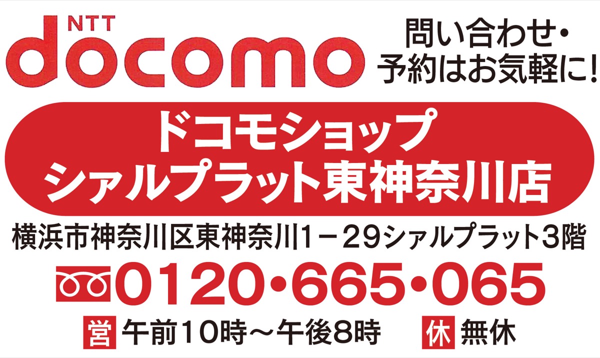 ドコモショップシァルプラット東神奈川店では現在、ガラケーから機種変更時に「タウンニュースを見た」の一言で、3G電波終了後も使える折り畳み携帯やスマホが”0円”になるキャンペーンを実施中(各限定10台)。今が機種変更のチャンスだ。