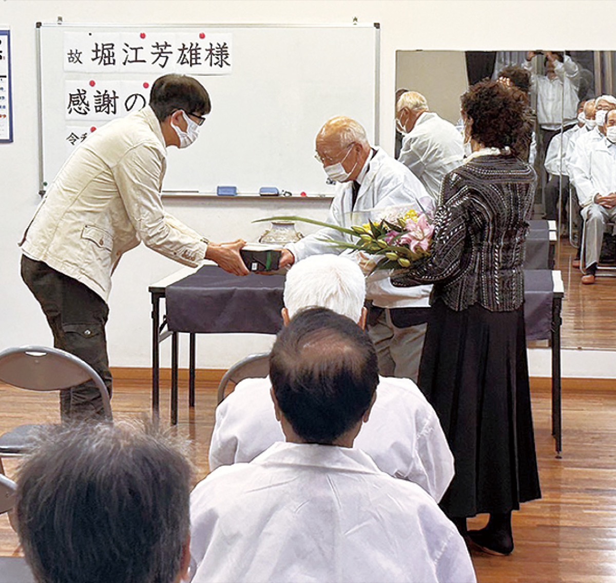 氏子総代会は、地元有志32人で構成され、宮司からの委嘱を受けて、同神社の維持・運営を担っている。今回の会議は2部制で実施。第1部では、先日逝去された前氏子総代代表の堀江芳雄さん感謝の会を執り行い、会員らで故人を偲ぶと共に、遺族へ記念品などが贈呈された=写真。