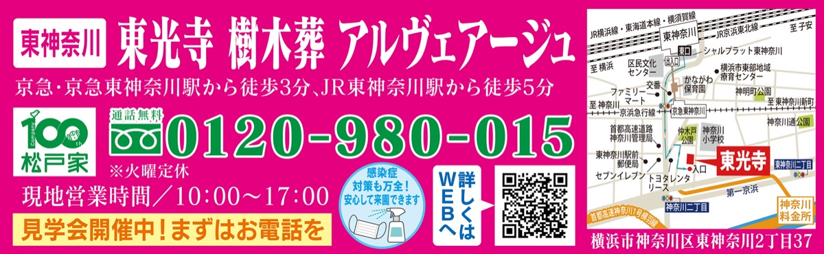 京急東神奈川駅から徒歩3分、JR東神奈川駅から徒歩5分の好立地に佇む由緒ある東光寺。ここに、販売以来大好評の樹木葬、フラワージュシリーズ『アルヴェアージュ』がある。樹木葬は、少子化による継承者問題の心配が不要という理由で購入者が増えているお墓のこと。最近は樹木の周りにガーデニング庭園風の植栽を配置したり、骨壺に工夫を凝らしたり、家族で個室を利用できたりと、多様性を増してきている。