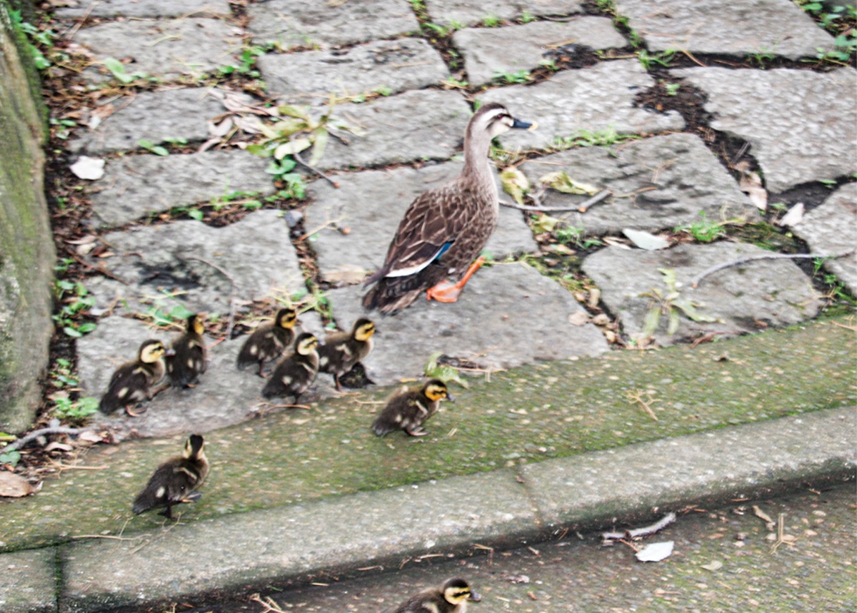 カルガモの親子が池で泳ぐ姿がこのほど、三ツ沢公園で確認された。同公園管理事務所によると、カルガモが子育てをする光景が三ツ沢公園で見られるのは、初めてだという。