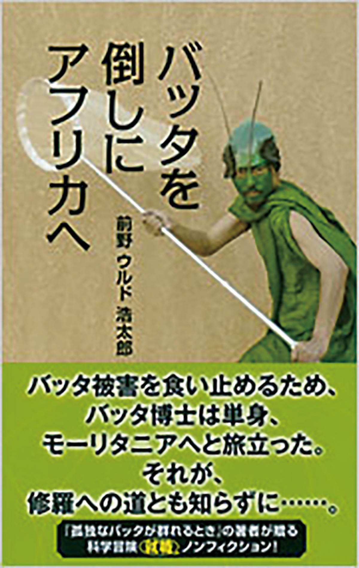 表紙の写真は、著者が西アフリカのモーリタニアで、バッタの研究のため緑色の衣装を身に纏い、バッタの大群に向かっていく姿です。しかし、実は着いたとたんに大干ばつが発生して、モーリタニアからバッタがいなくなってしまったのです。バッタがいなければ、研究論文も書けず、就職先も見つからず、貯金も底を尽き、大ピンチに。
