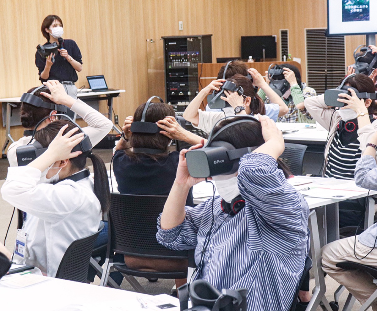 当日は、当事者の気持ちにより近づくためにVR看取り体験を実施=写真。救急搬送による救命処置の場面や、施設で最期を迎えた103歳の女性のドキュメントをVRで体験し、約40人の参加者たちは、それぞれの立場から意見を交わした。その他、横浜市医師会常任理事の赤羽重樹さんらによる講演も行われた。