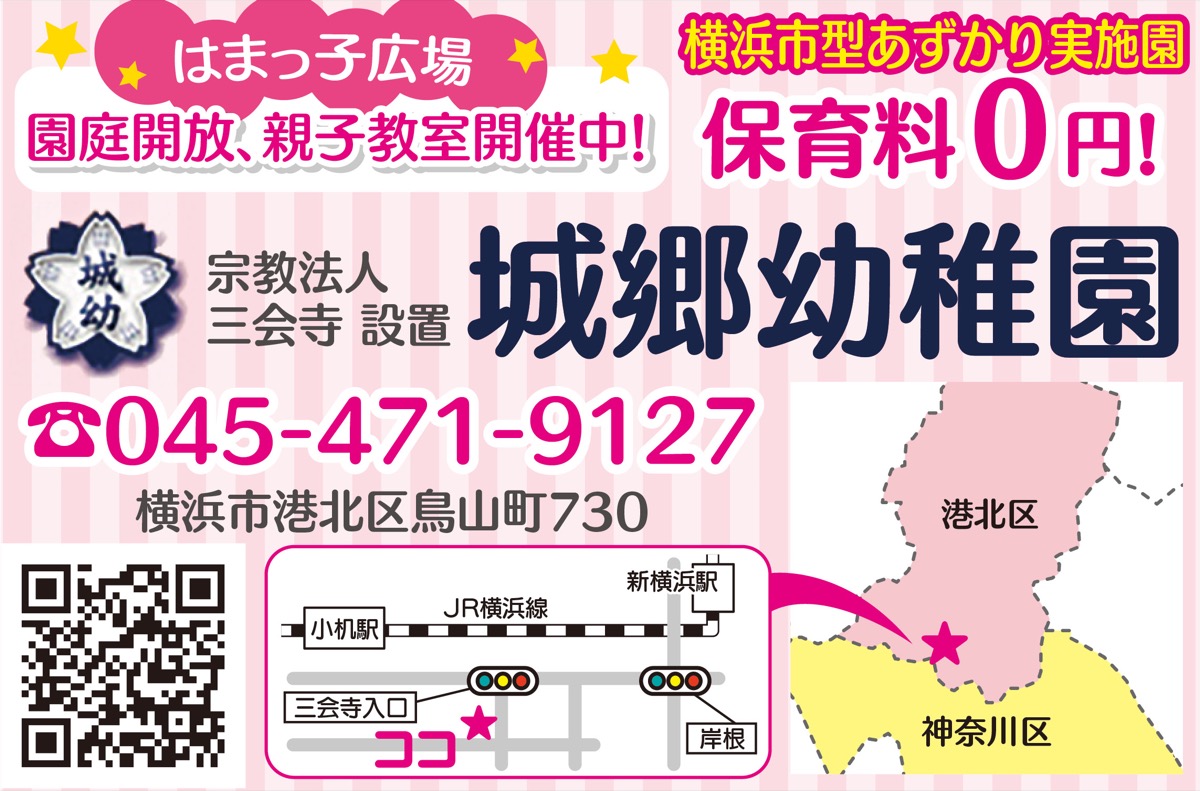 神奈川区の北側、港北区鳥山町にある城郷幼稚園では、園児たちの元気な声が毎日響いている。隣接する菅田町や片倉町などから来園する園児も多い。真言宗三会寺設立の同園では大型駐車場、駐輪場が完備され、預かり保育などの送迎も自家用車で楽々。通園バスは随時ルートを拡大して展開。羽沢・横浜国大周辺ルートの増設予定も。