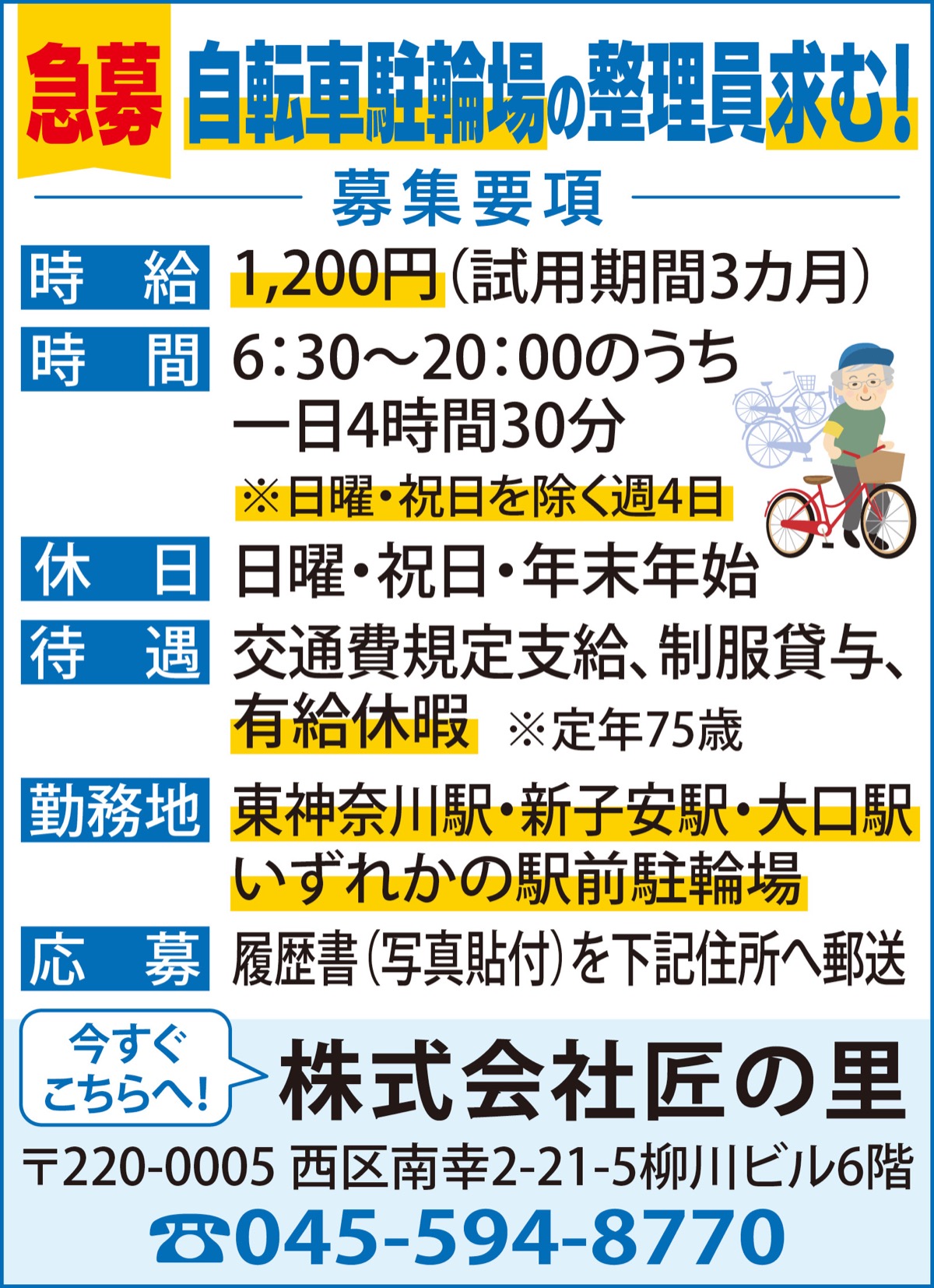 横浜市営の駐輪場管理を行う(株)匠の里が、業務拡大のため一緒に働く仲間(パート)を募集している。東神奈川駅、新子安駅、大口駅の駅前にある市営自転車駐輪場を管理運営する仕事。一日4時間半、週4勤務OKとあり、人気の求人だ。