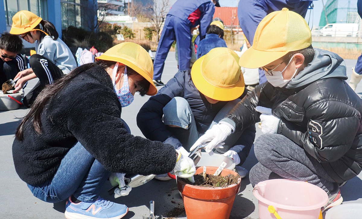 港湾・海岸整備に関する調査や技術開発を行う同事務所。学区内という縁から同小とは長年連携を続けている。今回はブルーカーボンをテーマに、海中や大気の二酸化炭素を吸収し「海のゆりかご」とも言われるアマモの移植を体験した。当日は、腐葉土や芝生などを混ぜ合わせて成長できる環境を鉢の中につくり、これまで学校のベランダで育ててきたアマモの苗を植えた。その後は、同事務所の人工干潟の海中に、ダイバーによって植えられた。