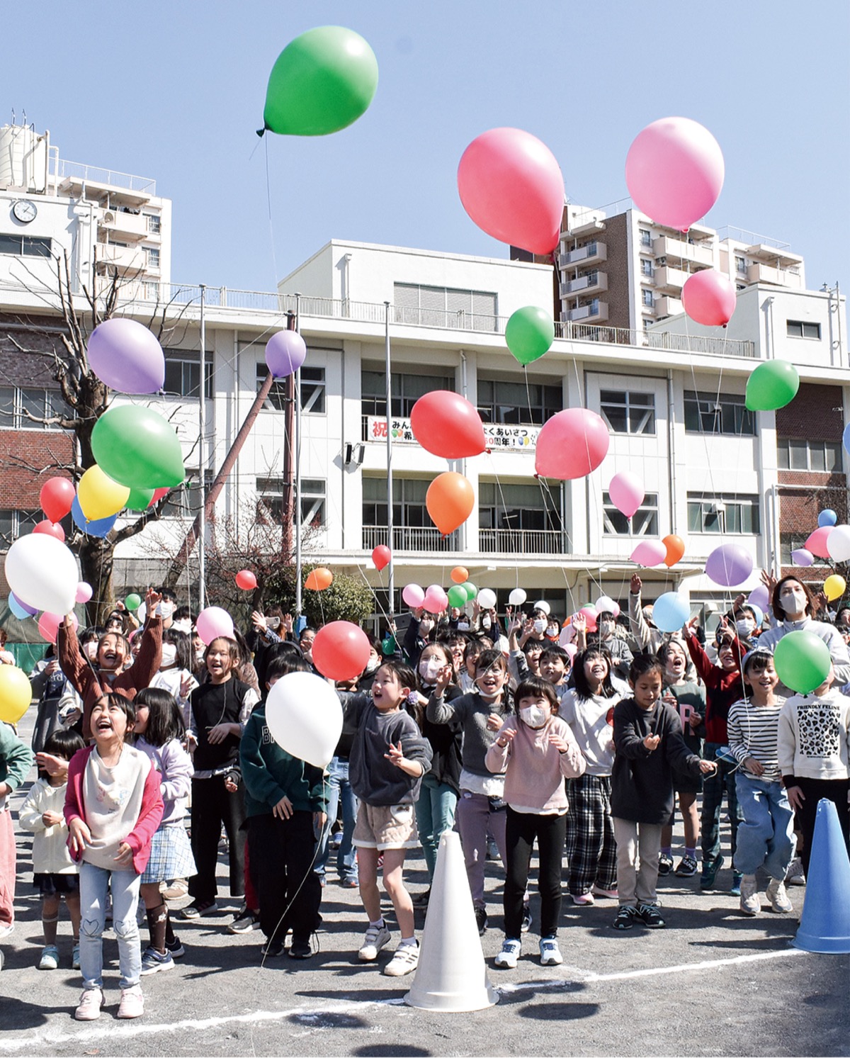 この日は階段装飾のお披露目を祝い、バルーンリリースを実施。全児童が校庭に集まり、岩田校長の掛け声に合わせて皆が風船を手放すと、児童228人の思いを乗せた風船は、春の風に乗って空へ飛び立っていった。