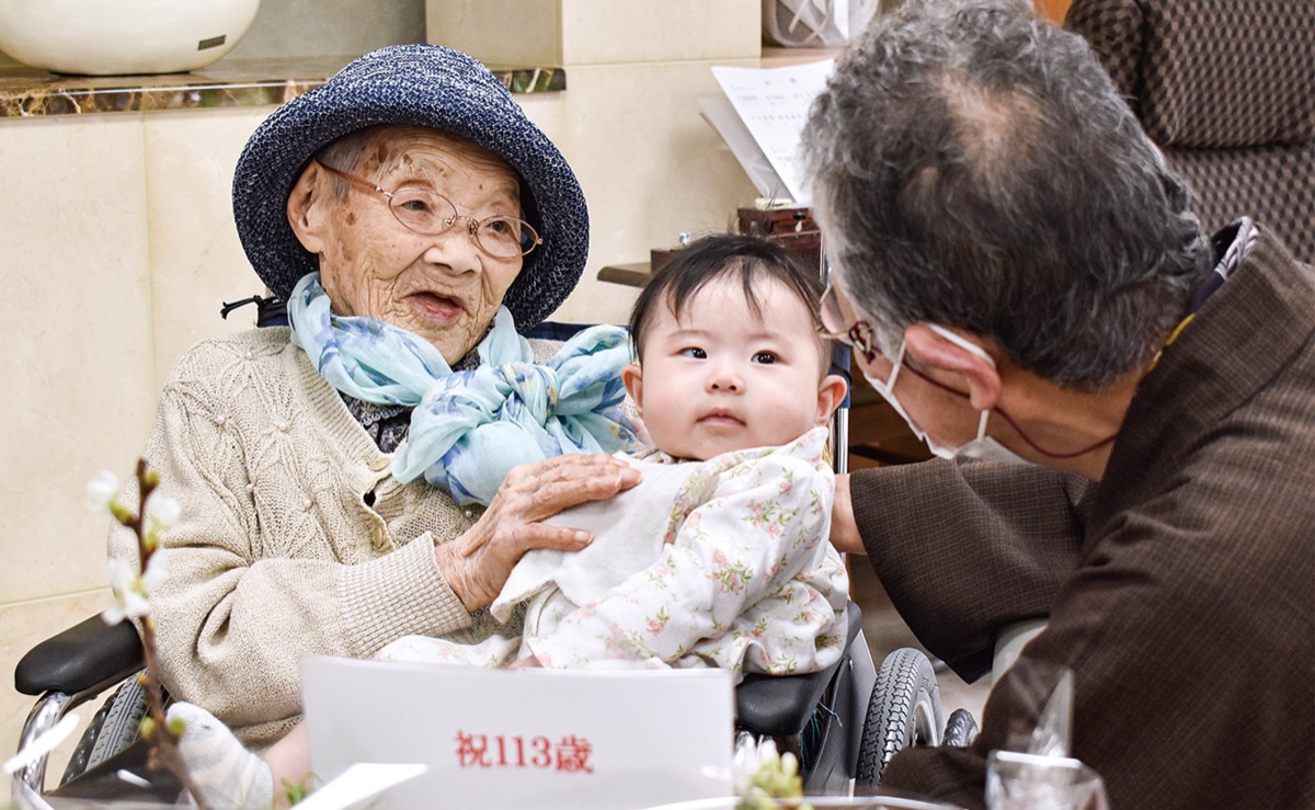 誕生日直後の週末には、長男の豊さん(91)ら家族と、世界各国の最高齢者の情報を集める調査会社「ロンジェビクエスト」のスタッフがのぶさんをお祝い。のぶさんは生後5カ月の玄孫(やしゃご)を抱くと、はっきりとした声で「かわいいやぁ」と呼びかけていた=写真。