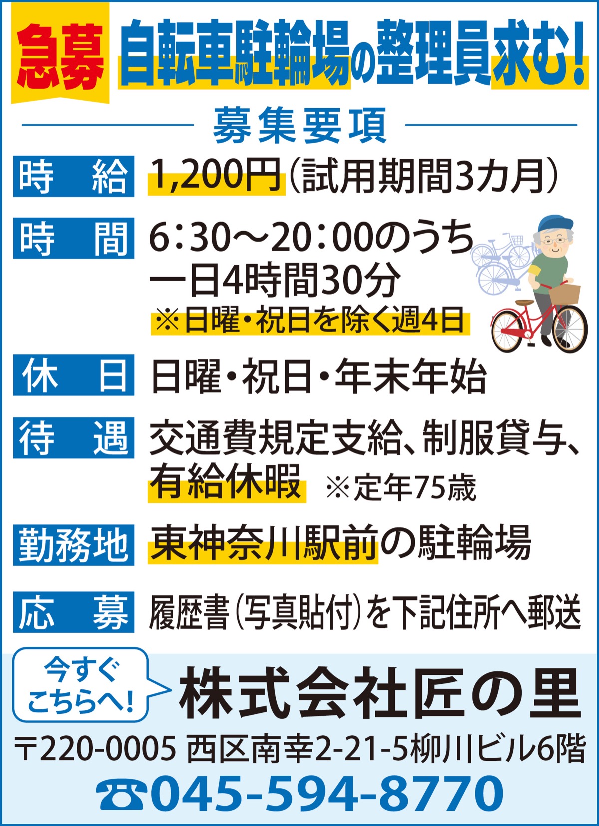 横浜市営の駐輪場管理を行う(株)匠の里が、業務拡大のため一緒に働く仲間(パート)を募集している。JR京浜東北線・横浜線の東神奈川駅前にある市営自転車駐輪場を管理運営する仕事。一日4時間半、週4勤務OKとあり、人気の求人だ。