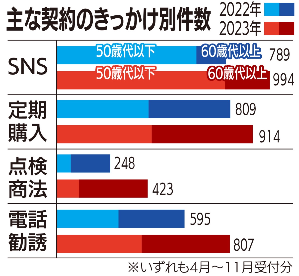 同センターに2023年度(4月〜11月)に寄せられた消費生活相談は、1万83件(前年比+228件)。年代別で見ると、50歳代以下の各年齢層では相談件数が前年度を下回っているのに対し、60歳代以上の各年齢層では前年度を上回っており、高齢者の相談が増加している。年々減少していた相談件数が21年度から22年度に増加に転じたのも、同様に高齢者増によるものだ。また、22年度に「主な契約のきっかけ」となったSNS、定期購入、点検商法、電話勧誘はいずれも増加=表参照。同センターの魚本一司センター長は「点検商法や電話勧誘は在宅している高齢者がターゲットになりやすく、周囲の方の見守りも含め、注意が必要」と話す。