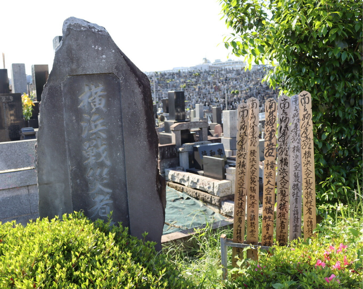 この慰霊塔とは別に、三ツ沢墓地の中にも戦災者の追悼施設が存在する。管理事務所そばにある横浜戦災者慰霊碑と合掌の碑、戦災遭難者諸霊供養塔だ。慰霊碑は横浜市、合掌の碑は横浜戦災遺族会がそれぞれ建立したもの。供養塔の建立者は不明だが、3つの中で一番早い1947年に建てられている。
