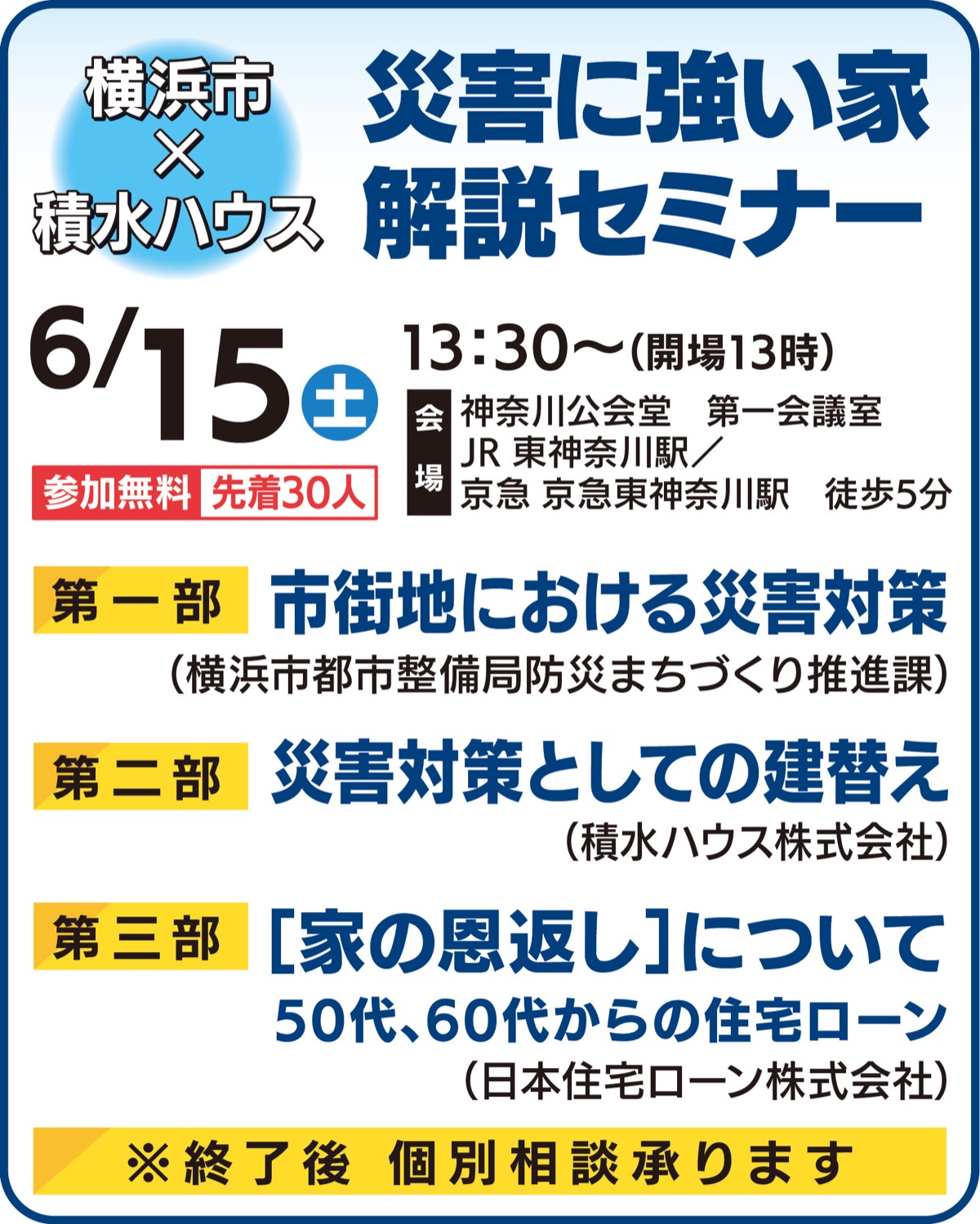個人住宅の視点から「災害に強いまちづくり」について学べるセミナーが6月15日(土)、東神奈川駅徒歩5分の神奈川公会堂で開催される。午後1時30分開始。主催は積水ハウス(株)。
