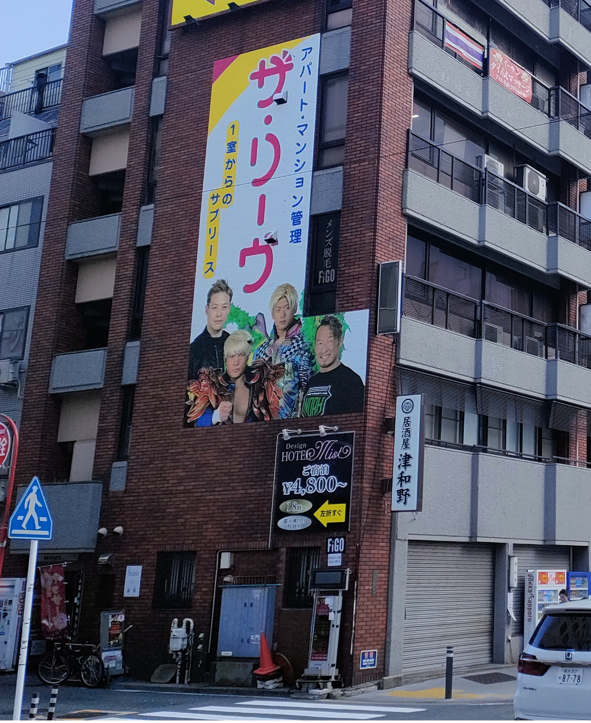 BUNTAIそばの飲食店などが入るビル壁面にノアを長く支えている不動産会社「ザ・リーヴ」(株式会社リーヴライフ トゥエンティーワン=本社・西区)の看板広告が掲げられた。この中に拳王選手の写真も入っており、「看板を見て気分良くBUNTAIへ行ってほしい」と笑った。