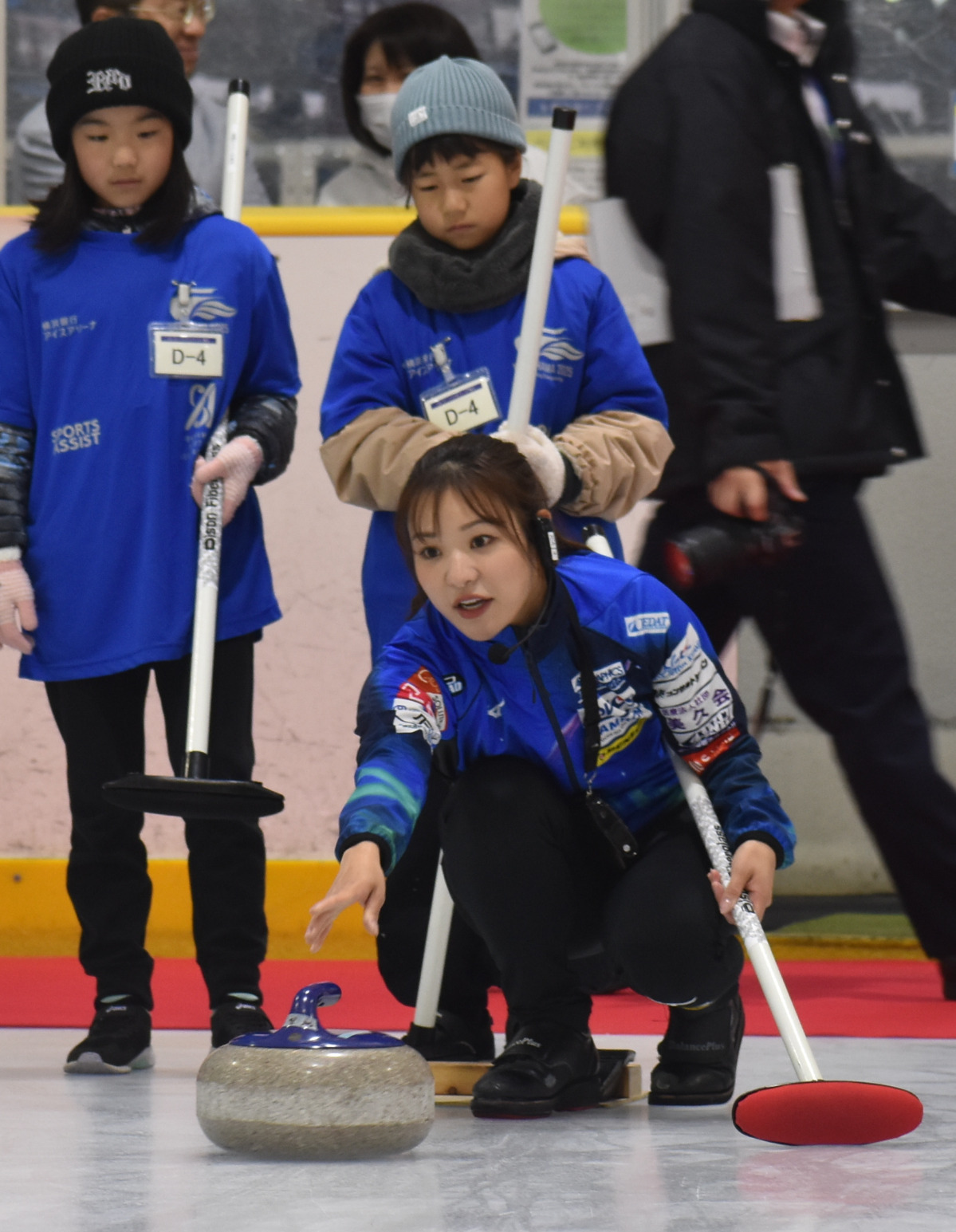 講師を務めたのは、2022年の北京五輪で銀メダルを獲得した「ロコ・ソラーレ」の藤澤五月選手と吉田知那美選手、2018年の平昌五輪に出場した「SC軽井沢クラブ」の山口剛史選手ら7人。それぞれストーンの投げ方やブラシで氷上を擦り進路を調整するスイープのやり方などを、自ら手本を示して教えていた。子どもたちの投球には「上手上手」と、試合さながらのポジティブな掛け声で後押ししていた。