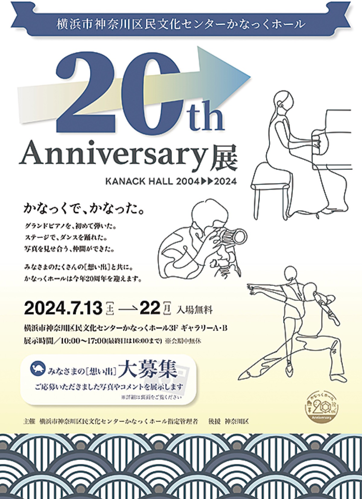 横浜市神奈川区民文化センターかなっくホール=東神奈川=が開館20周年を迎える。節目を記念して7月13日(土)からは記念イベントも開催。現在、同イベントで展示する「想い出の写真」を募集している。6月30日(日)必着。