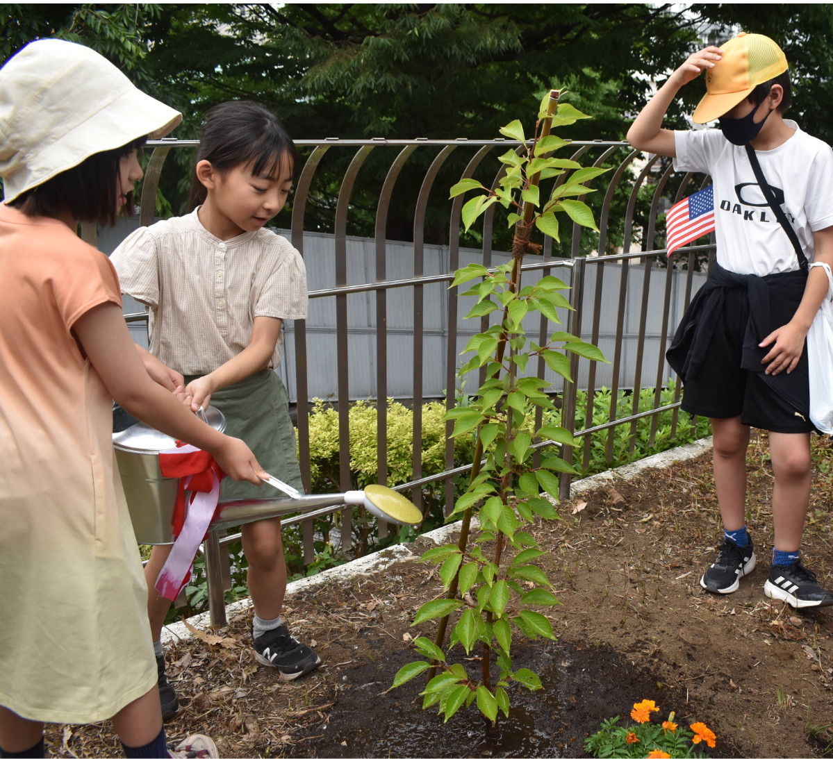 植樹式では関係者がシャベルとジョウロを手にし、苗木に水と土をかけた。シドモア桜の会横浜の梅本千晶代表理事は「皆さんで一緒に桜の成長を見守って頂けたら」と呼びかけた。