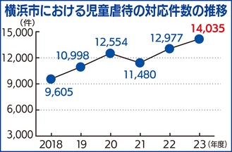 横浜市における児童虐待の対応件数は年々増加を続け、19年度に初めて1万件を突破。20年度は1万2554件で過去最多を更新した。21年度は減少に転じたものの、22年度は1万2977件に。23年度は前年より8・2%増え、初めて1万4千件台に達した。
