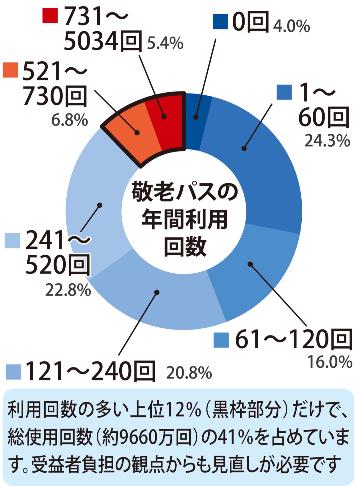 公表された分析結果によると、年齢別の月平均利用回数では75歳(22・4回)をピークに年齢が高くなるほど利用回数が減少していることや、今後利用回数の多い70〜84歳の人口が減少することで年間の利用回数は減少または同程度で推移する見込みであること、敬老パス保有者は持っていない人に比べて外出頻度が高く、要介護認定を受けることが少ない傾向がみられることなどが示されています。